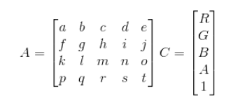 接下来讨论一下滤镜的原理,安卓系统使用一个颜色矩阵 ColorMatrix(下图 A 表示) 来处理图像的颜色,对于每一个像素点都有一个颜色分量矩阵来保存的 RGBA 值(下图 C)。