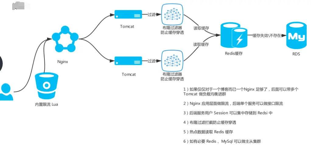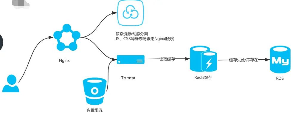 后端服务链接资源是宝贵的,在高并发下,会拖慢整个系统的响应时间。这里我们可以把一些热点数据进行缓存,后端读取缓存,如果数据存在则直接返回,否则再去读取数据库。