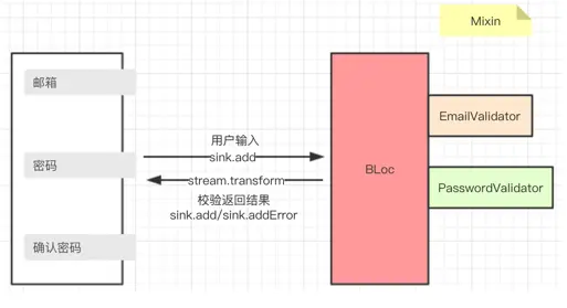 PS: Mixin 为bloc类增加了两个功能,根据输入流,进行相应的校验邮箱和密码是否符合要求