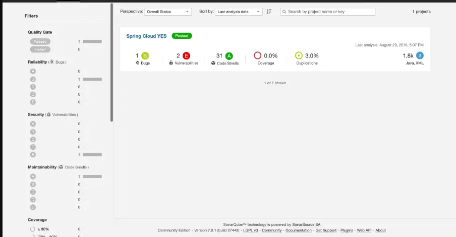 如右上角所示,此时可以看到SonarQube已经为我们分析了一个项目,该项目有1个Bug、2个脆弱点、31个代码味道问题。点击项目名称(图中的 Spring Cloud YES)即可看到详情,可以根据SonarQube给我们的提示进行修正、重构。