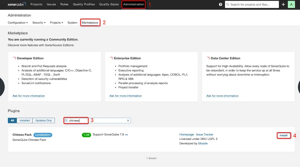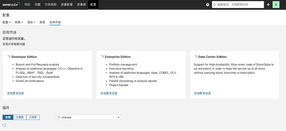 SonarQube有一个强大的插件机制。以安装汉化插件为例——