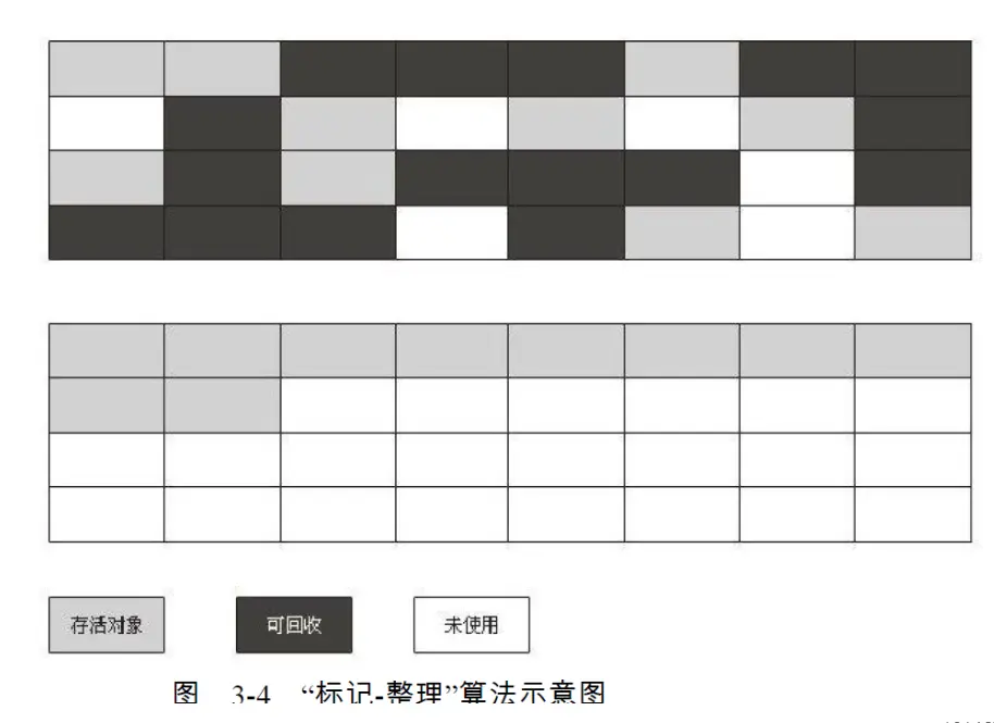 标记整理算法,顾名思义,先标记再整理。它的标记过程跟标记清除算法的一样的,把标记的对象清理。