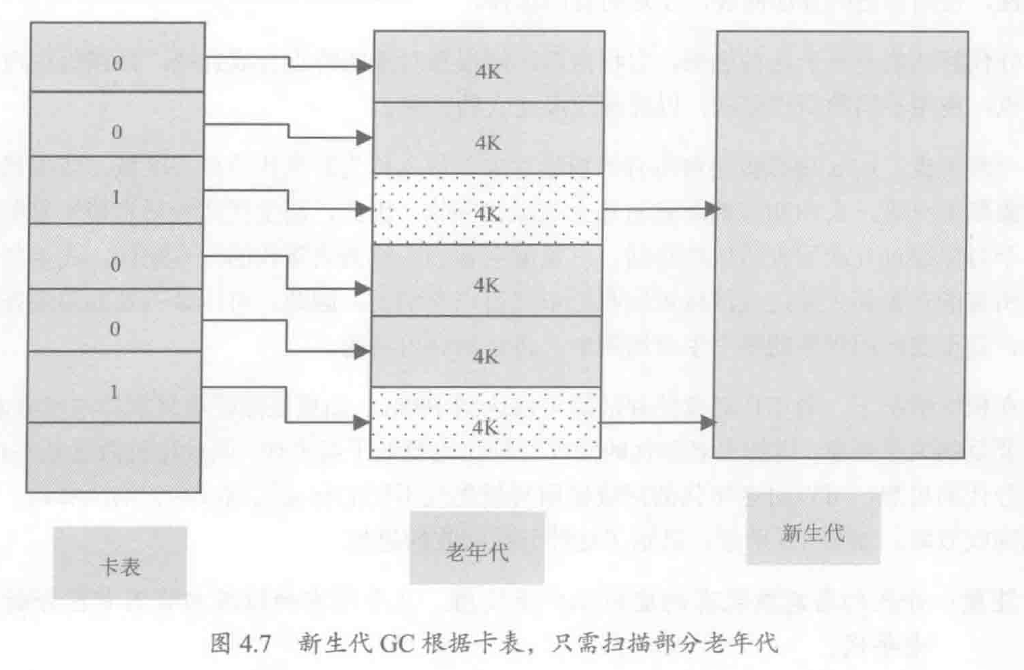 为了支持高频率的回收,比如新生代,虚拟机还会可能使用一种卡表的数据结构,卡表为了一个比特位集合,每一个比特位可以用来表示老年代的某一块区域中的所有对象是否持有新生代对象的引用。这样在新生代gc时,可以不用花大量的时间来扫面老年代对象,来确定每个对象的引用关系,可以先扫面卡表,只有当卡表标记为1时,才需要扫面给定区域的老年代对象,而卡表位为0的所在区域老年代区域,肯定不含新生代对象的引用。使用该方式,可以大大加快新生代的回收速度。