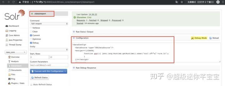 如下图,在solr admin中选择dataimport选项卡,由于dataimport配置支持脚本,我们可以在配置文件中写入恶意脚本,执行curl xxx.xxx.xxx.xx指令。