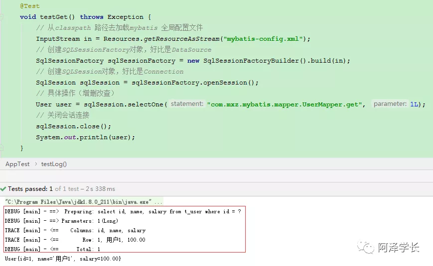 可以看到控制台输出了 DEBUG 和 TRACE 级别的日志信息,因为我们自定义设置的 Mapper 映射文件对应包下的日志级别为 TRACE,所以会打印出 TRACE 级别以上的日志信息。