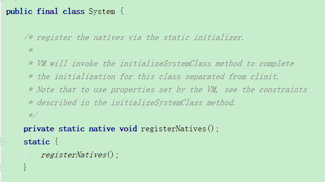 1、System是一个final类,调用native方法registerNatives(),注册本地方法,实现对象初始化