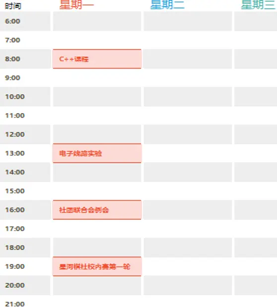 在原计划中呢,本来是想以周为单位来规划,实际操作了一段时间,发现不可控的事情会很多,反而容易变乱,不如每天晚上拿出一段时间来规划下一天。首先,先把必须要做的事情所占用的时间占上,就像这样: