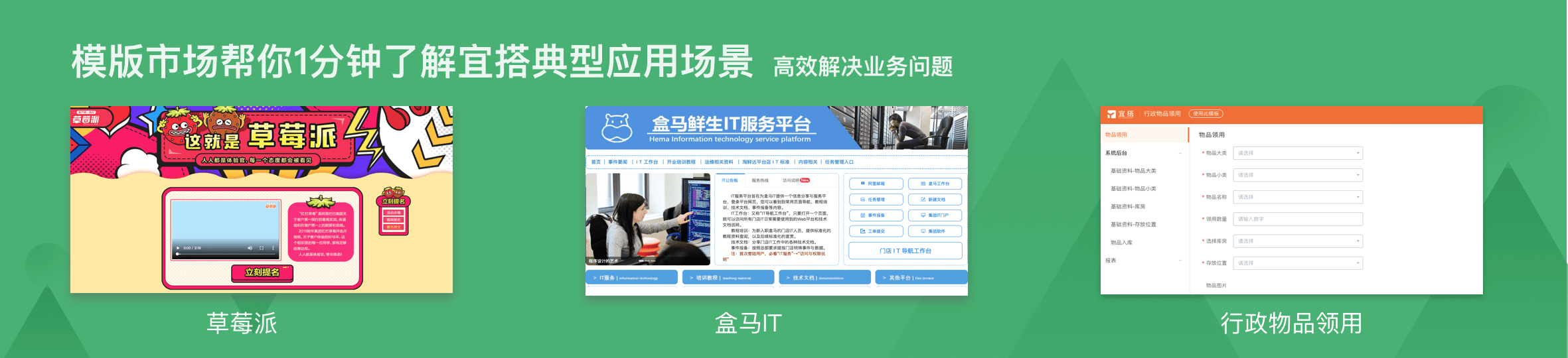 具体业务场景如:报名登记、调查问卷、财务管理、人力资源管理、行政管理、资产管理、客户管理、工作流转、任务审批等等。