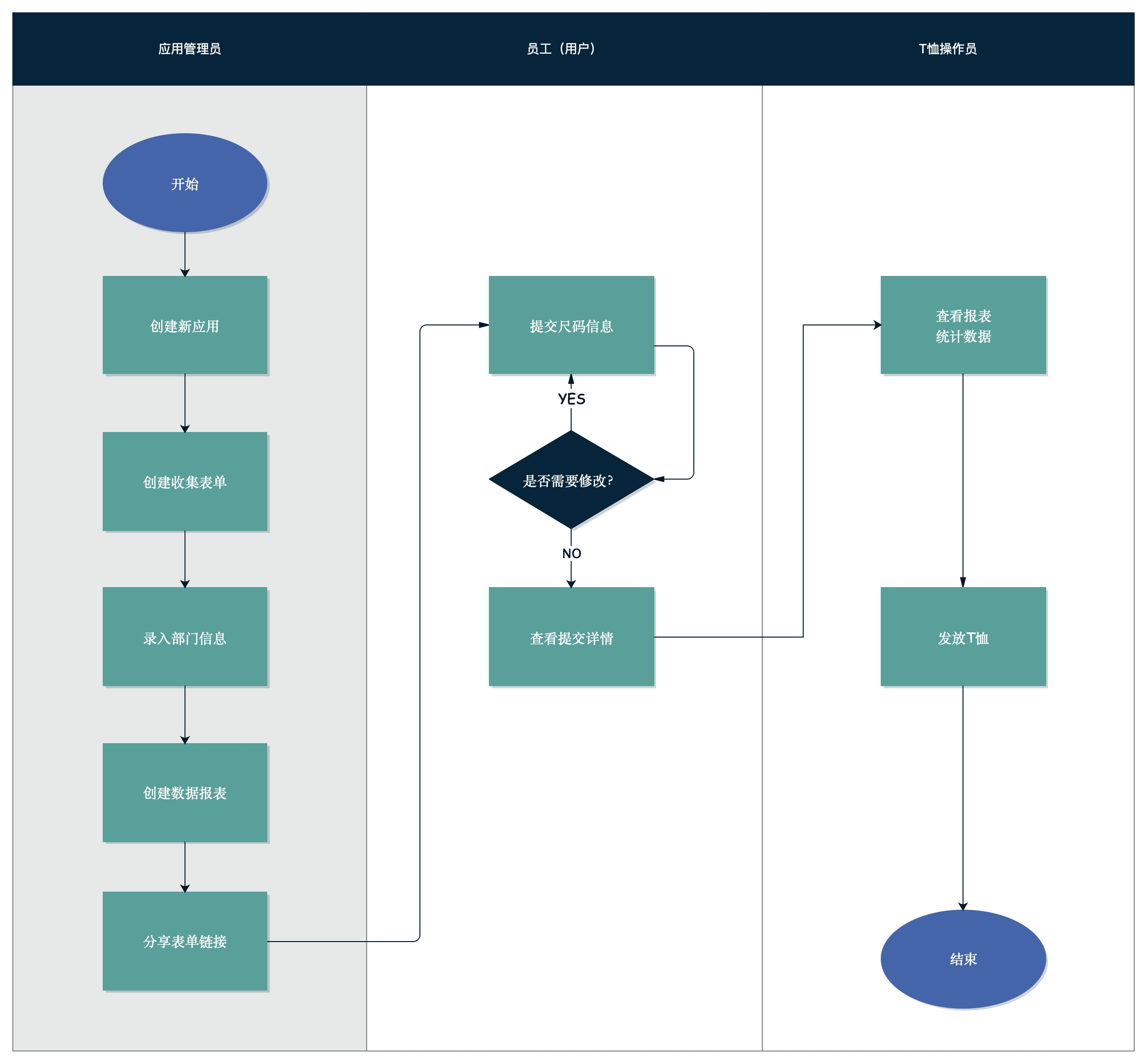 在流程中,有三种角色,分别是应用管理员、员工(用户)、T恤操作员。