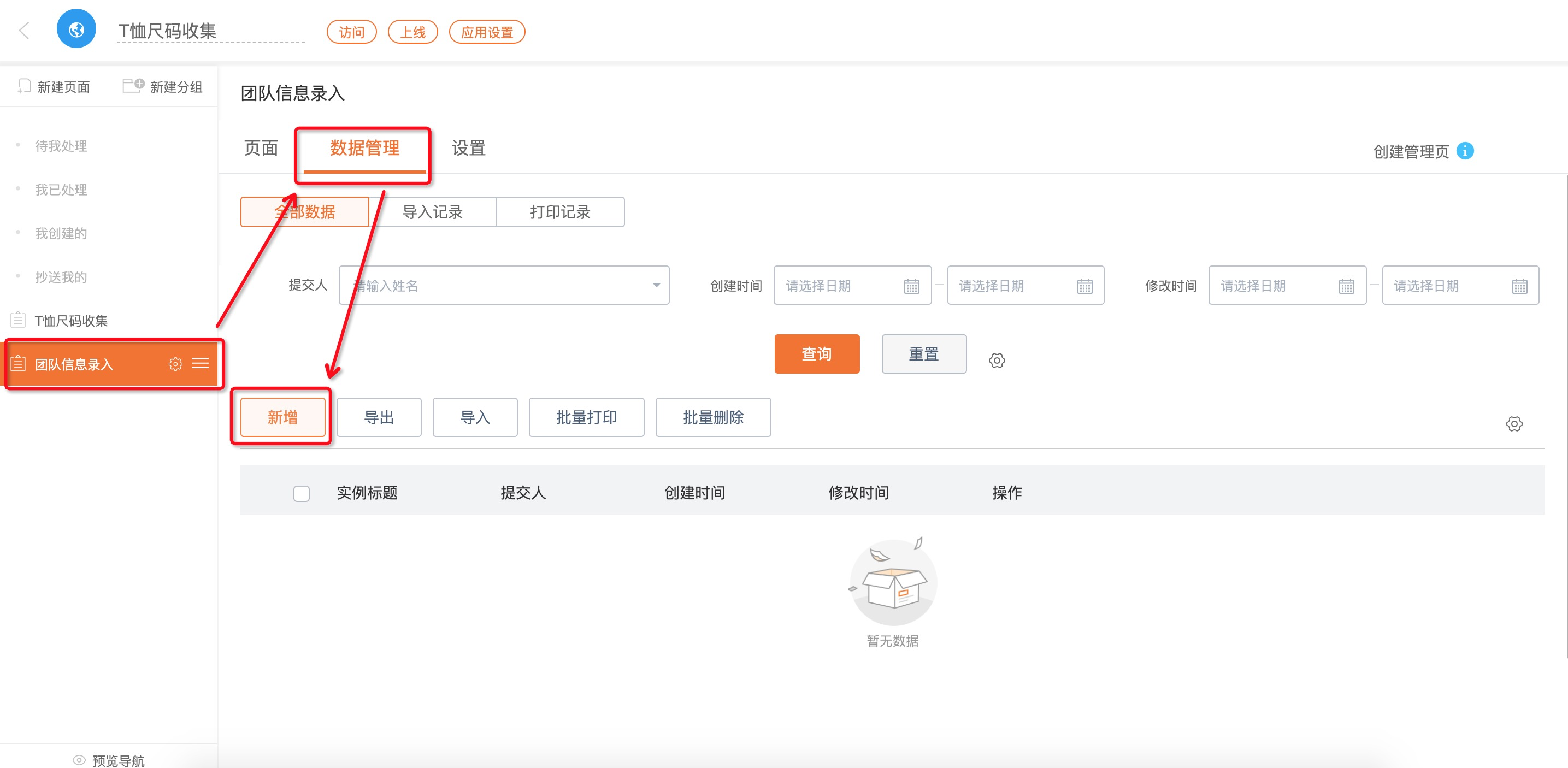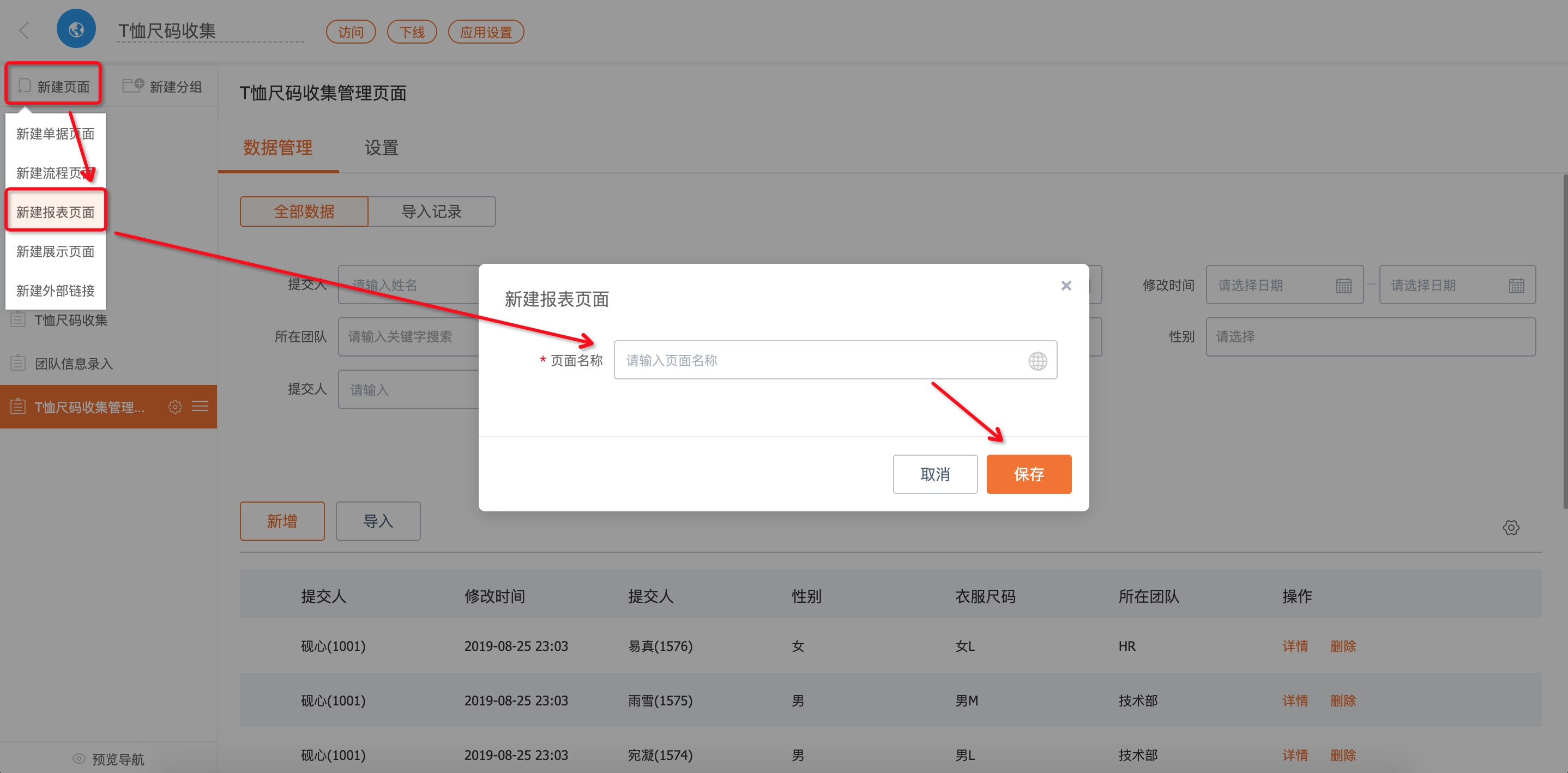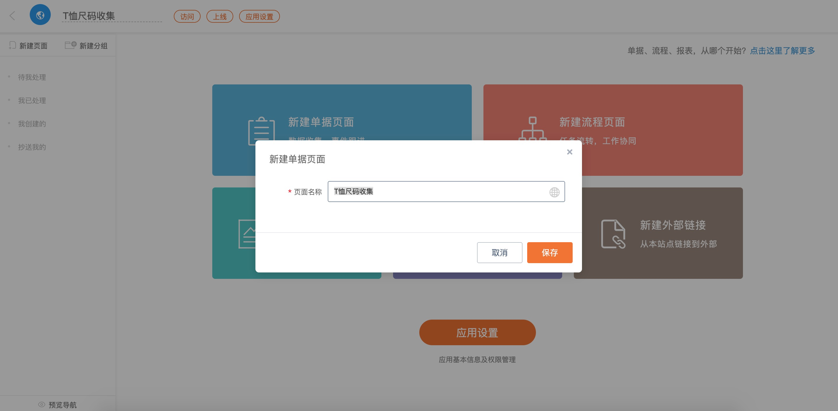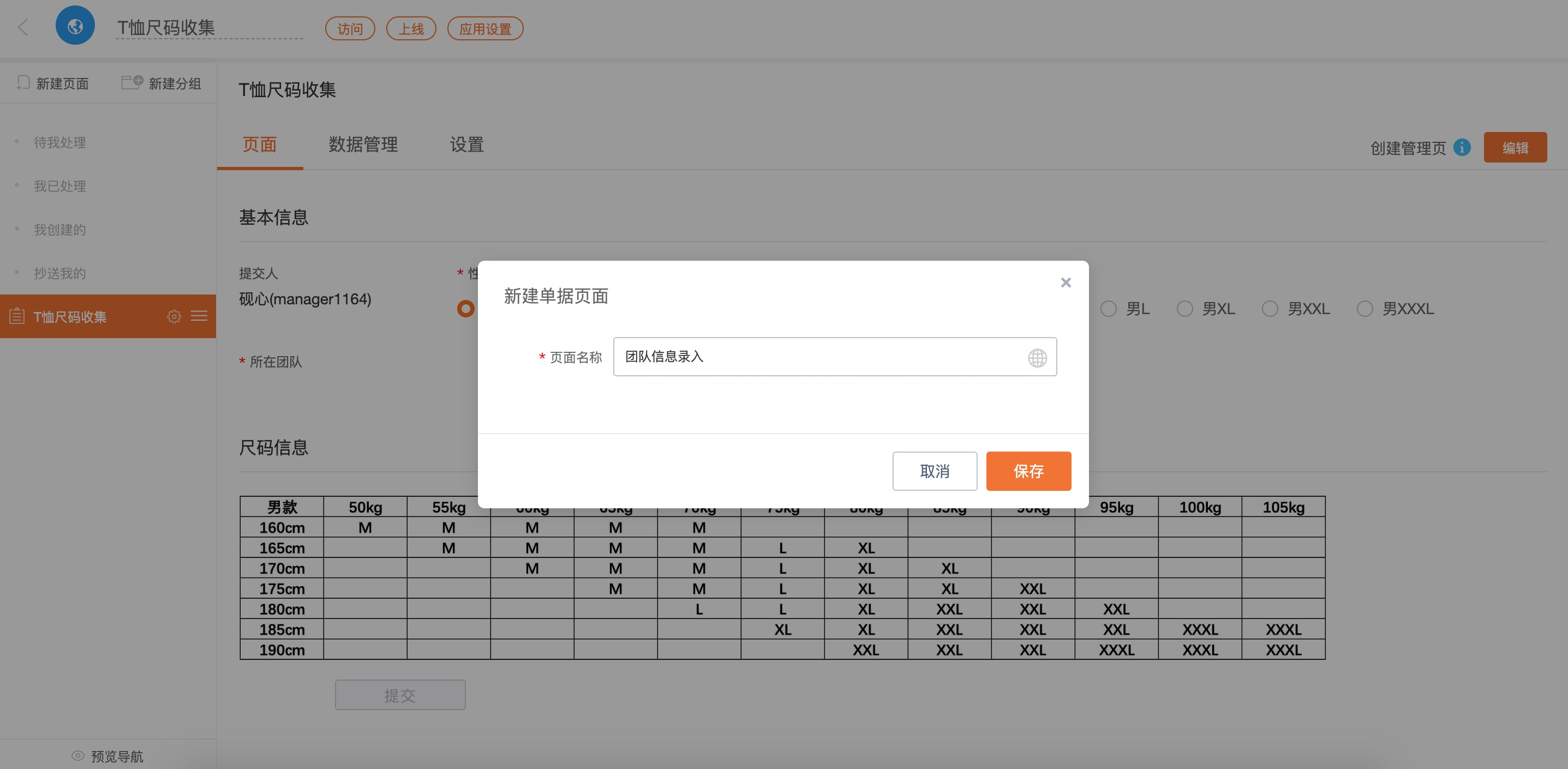 下面,我们来看一下用宜搭搭建《T恤尺码收集》应用的基本流程。