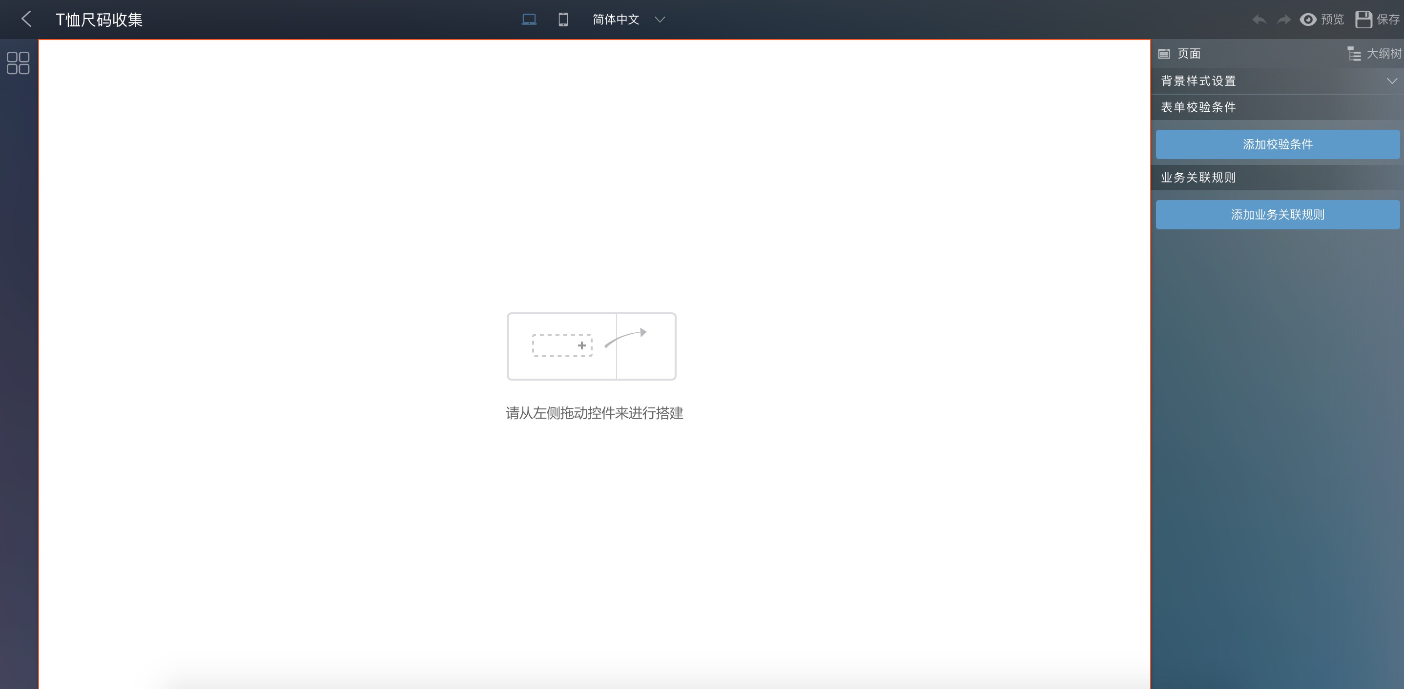 然后,同表单页面一样,按照右边大纲树的组件排列结构,将相对应的组件拖入到设计器中。