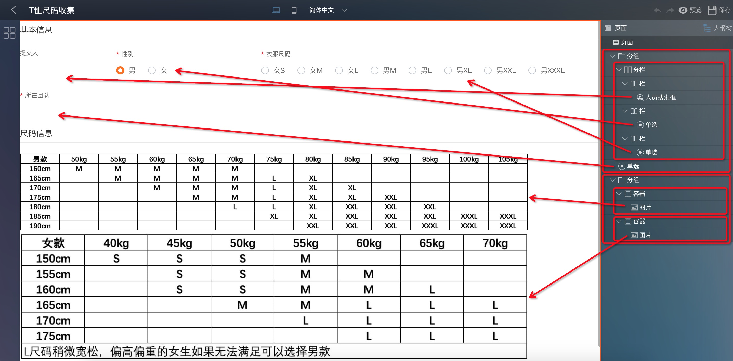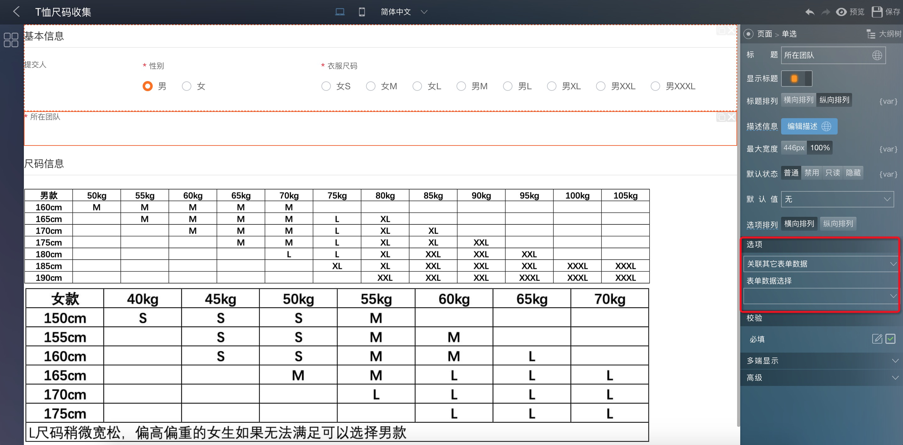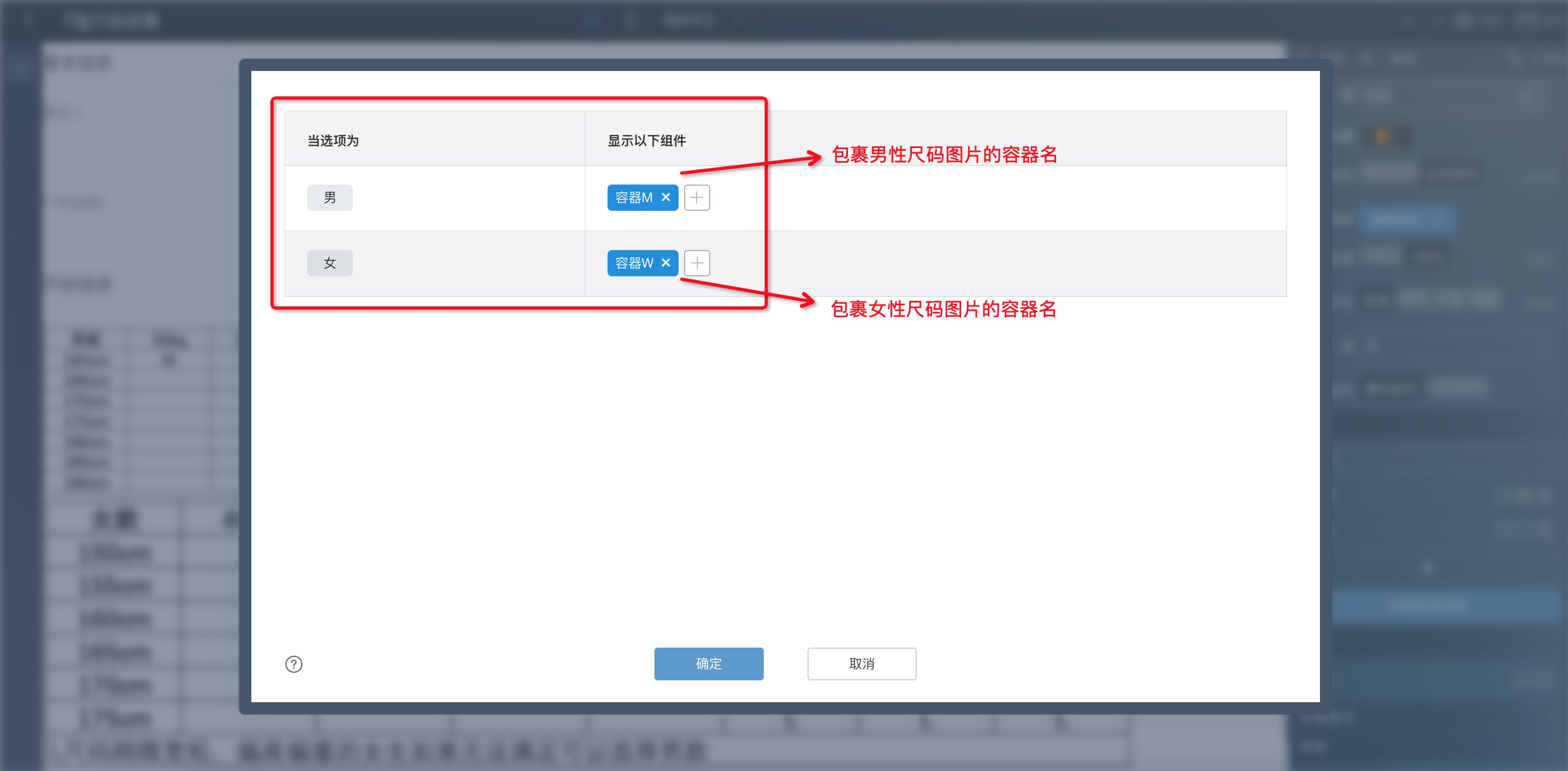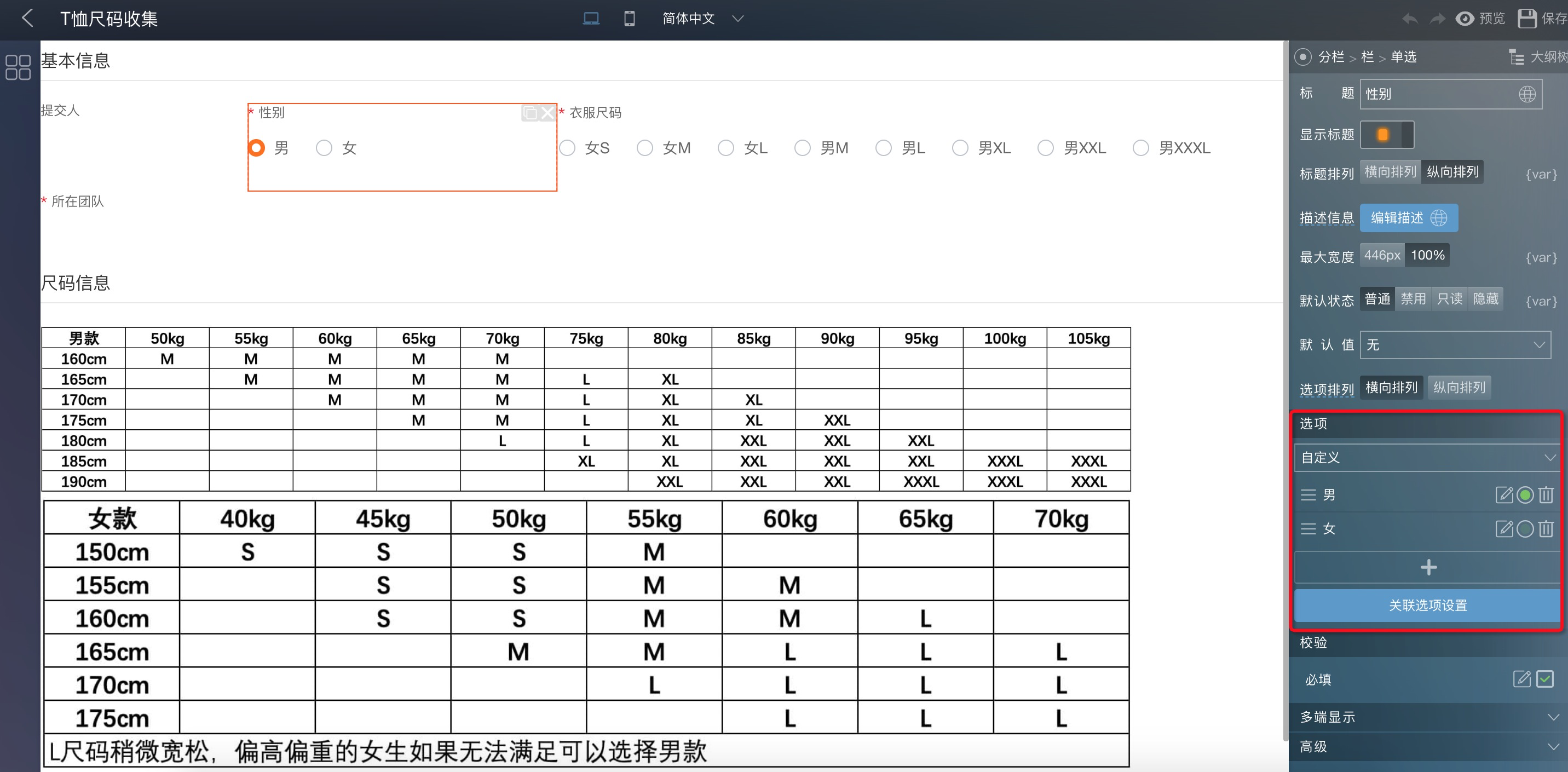单选组件(性别),添加“男”和“女”两个选项,同时选择“关联选项设置”,当选项为“男”时,显示包裹男性尺码图片的“容器M”,当选项为“女”时,显示包裹女性尺码图片的“容器W”。
