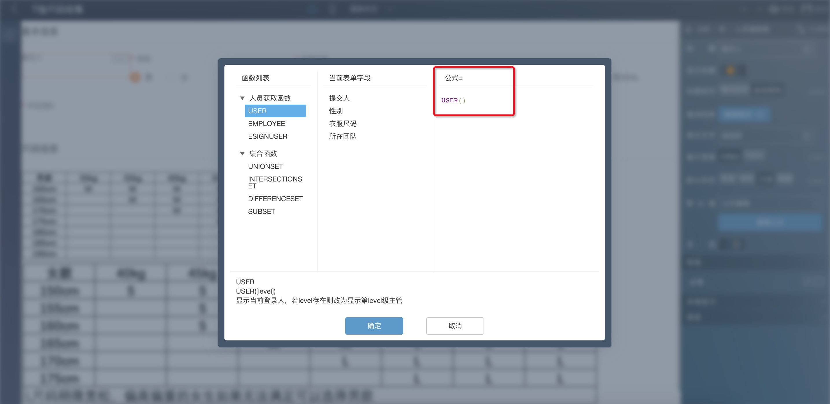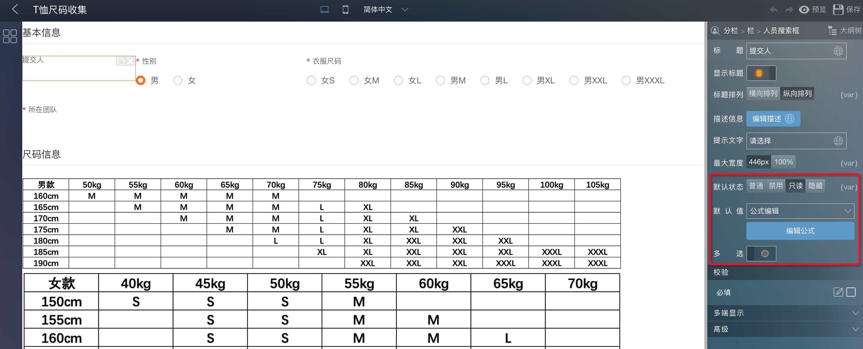 人员搜索框组件(提交人),设置为“只读”态,然后默认值采用“公式编辑”,插入“USER()”获取当前登录人的信息,多选则去掉。