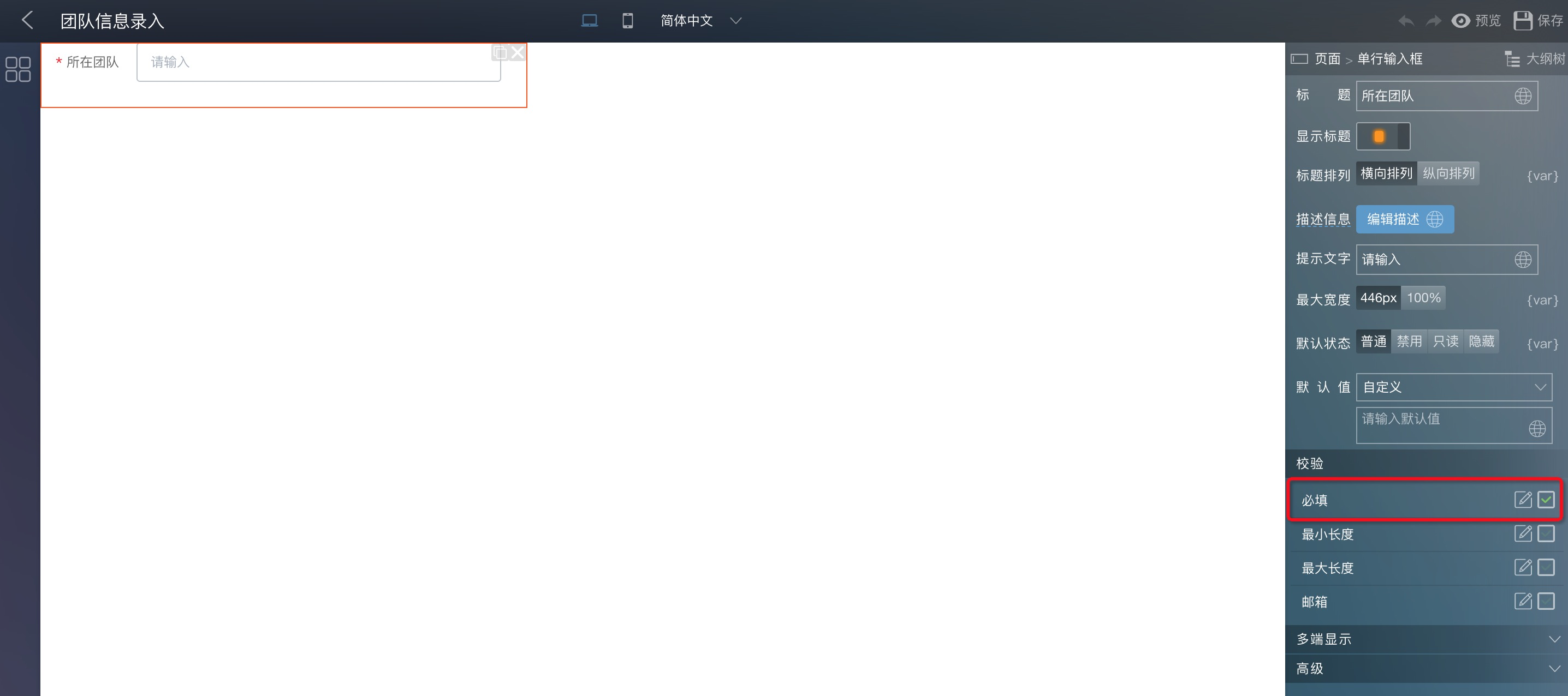 新创建一个单据页面,名字叫“团队信息录入”,然后拖入一个“单行输入框”组件,取名为“所在团队”,设置为“必填”校验即可。