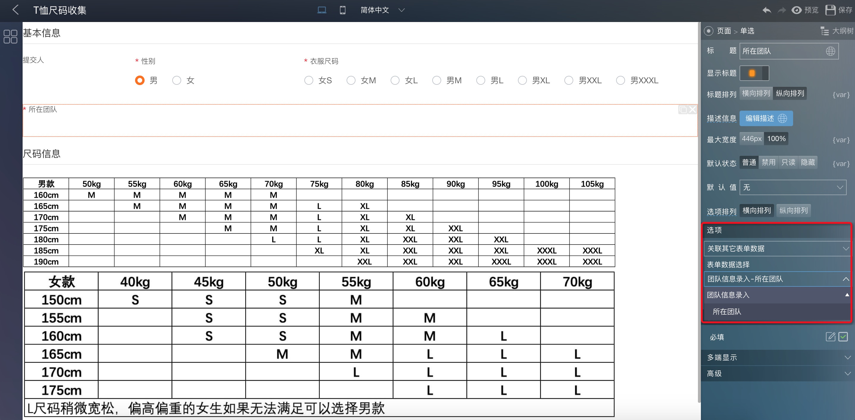 这时候,我们再来关联上“团队信息录入 -> 所在团队”的字段,这样后面“团队信息录入”中填写的数据就会作为“所在团队”的选项值出现。