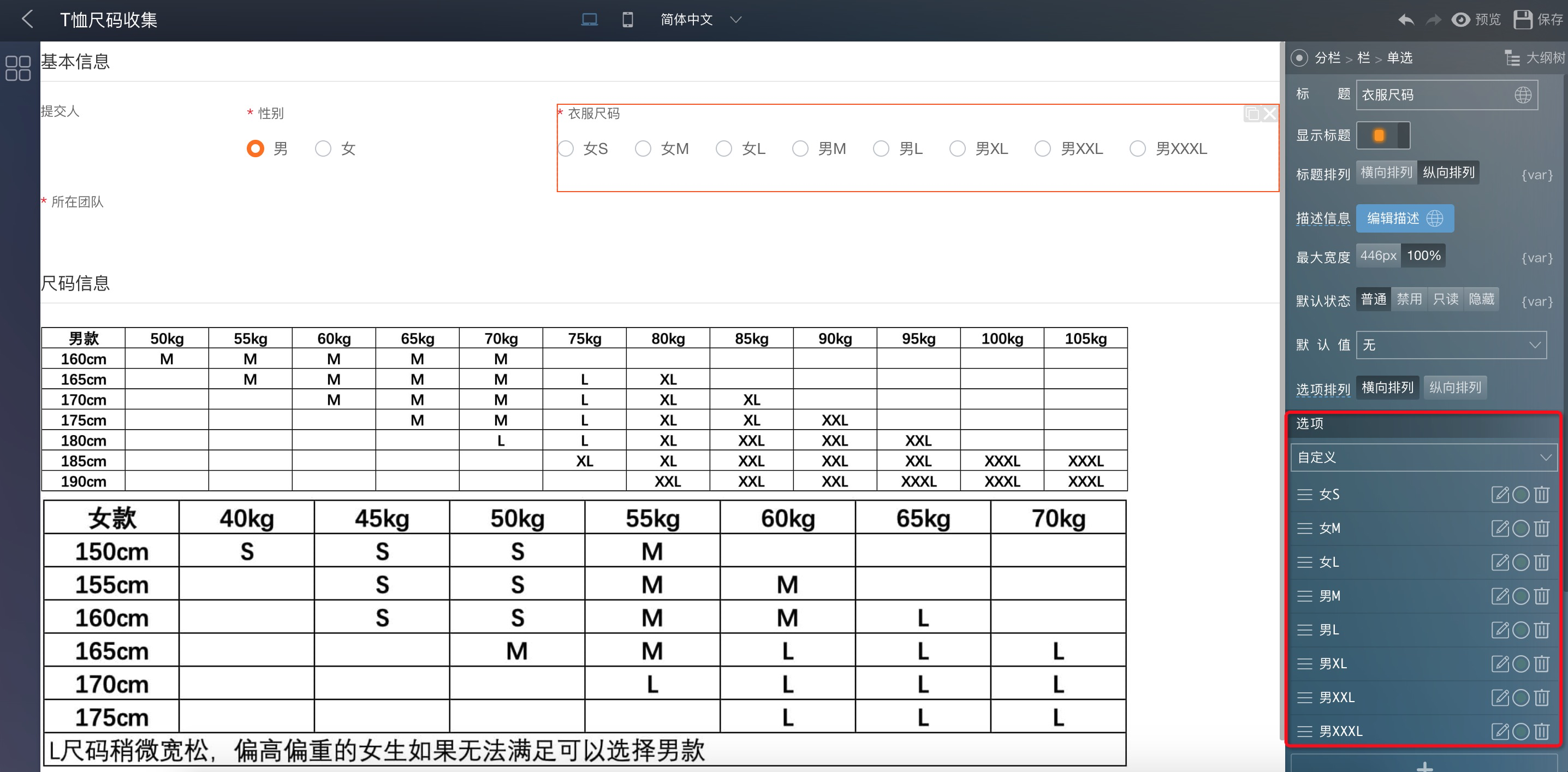单选组件(衣服尺码):设置选项为红框列表中的选项即可。