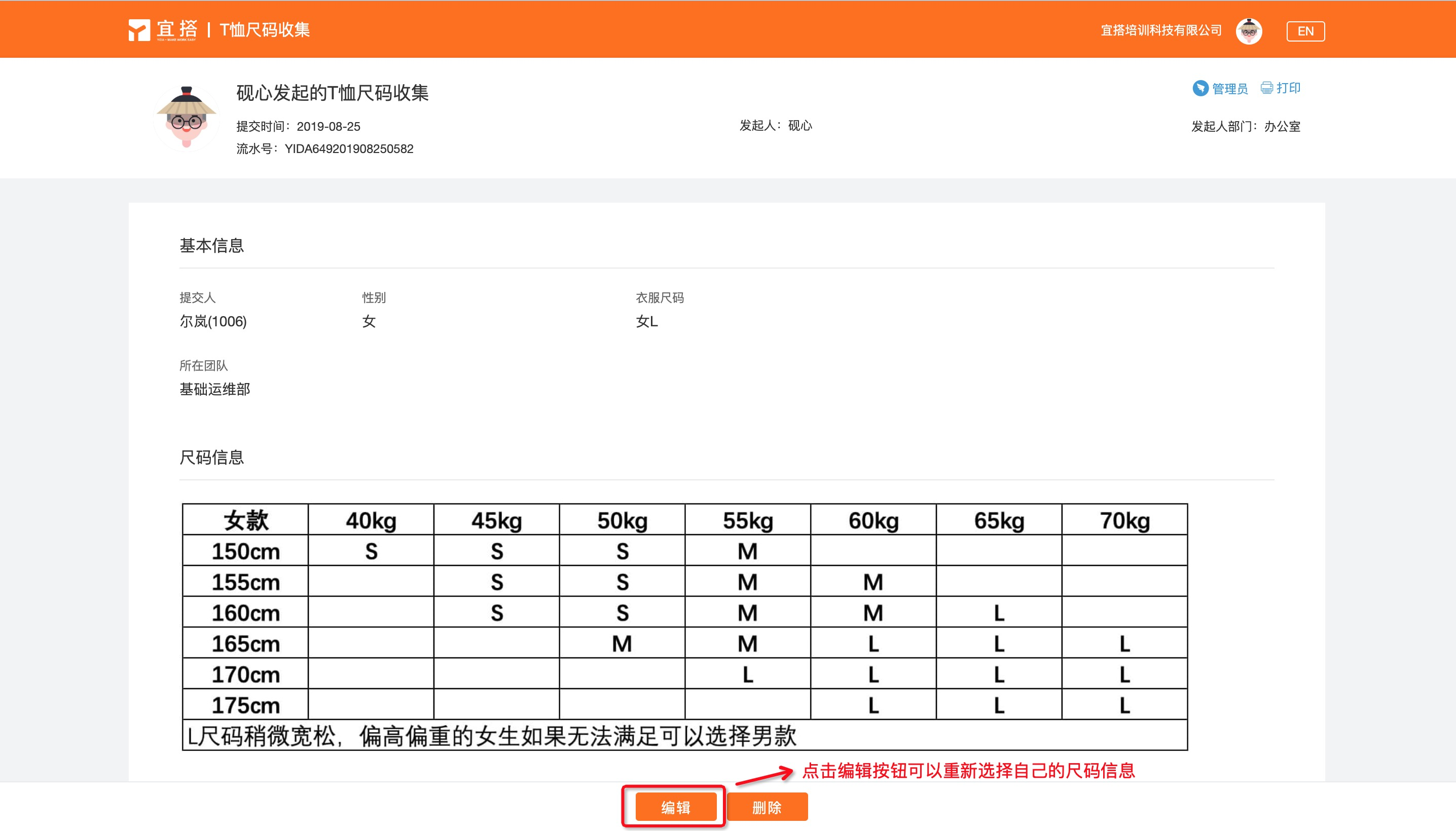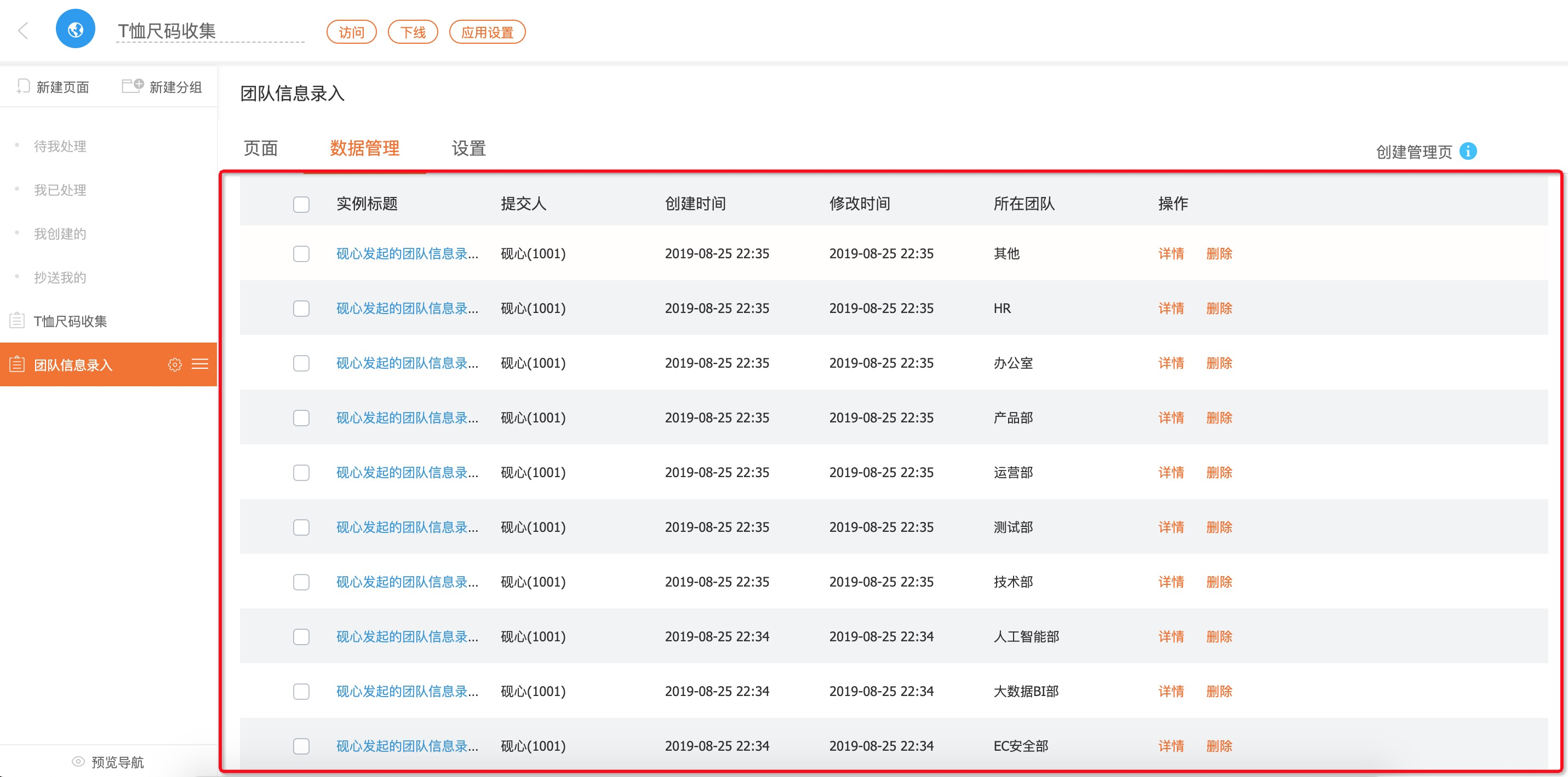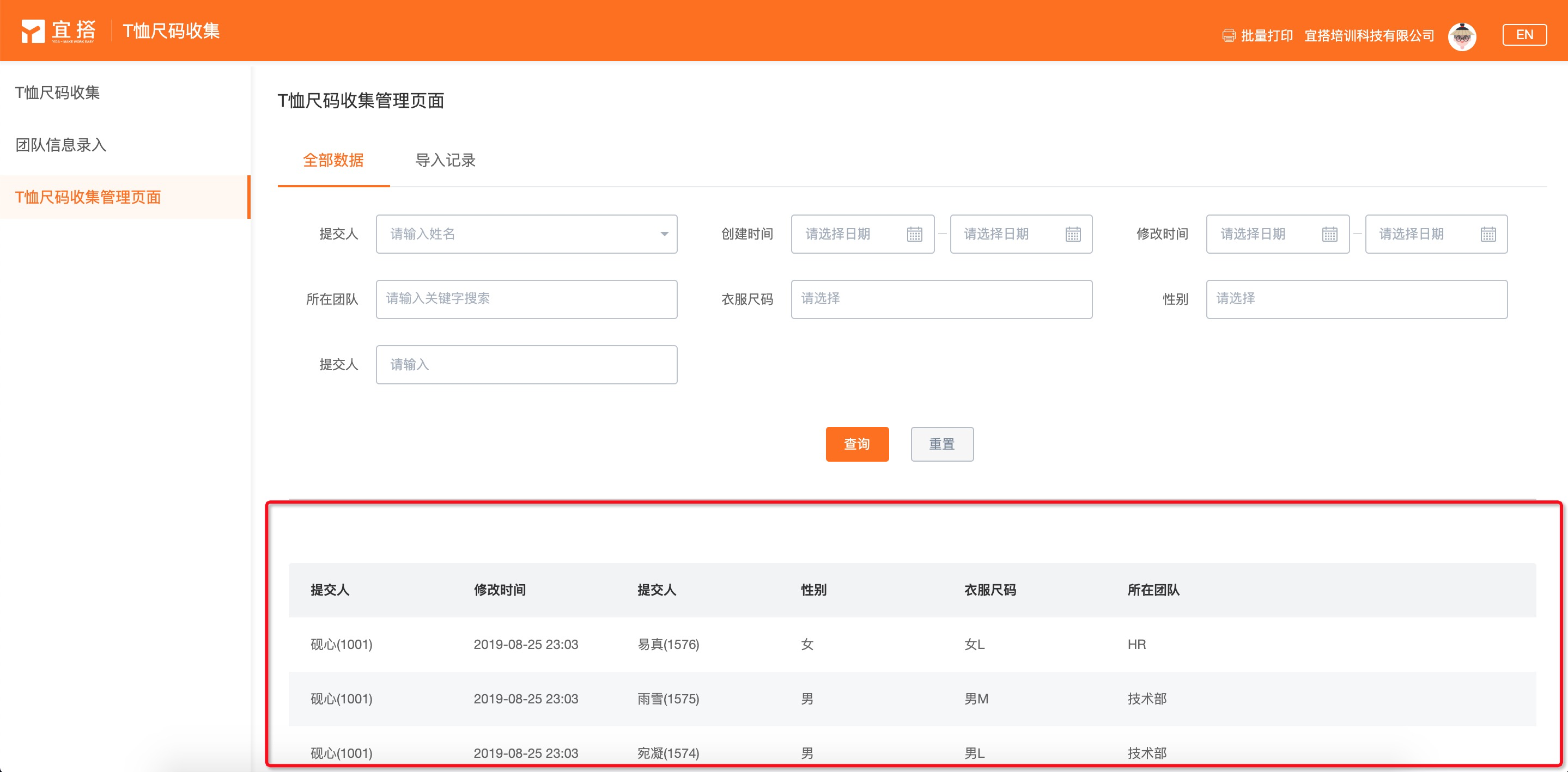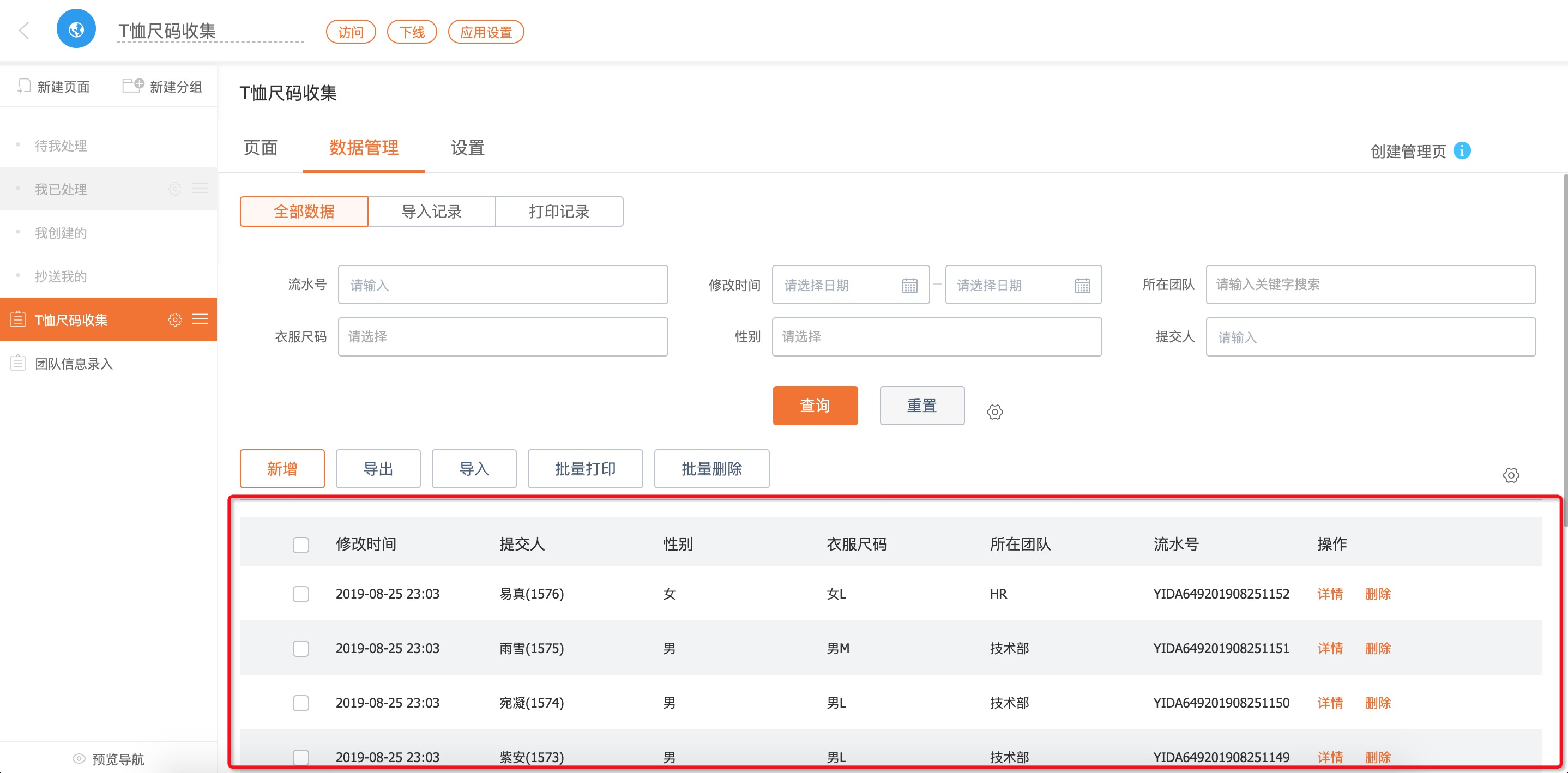 当所有员工的信息都提交完毕后,我们再“T恤尺码收集”的后台数据管理,就可以看到所有的提交数据。