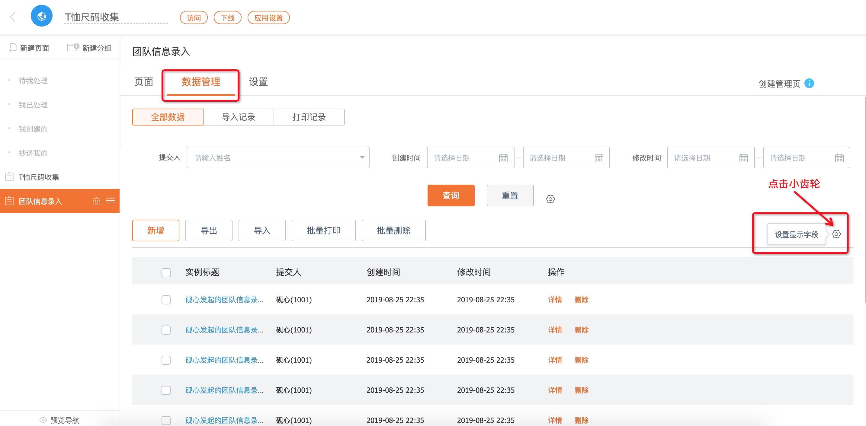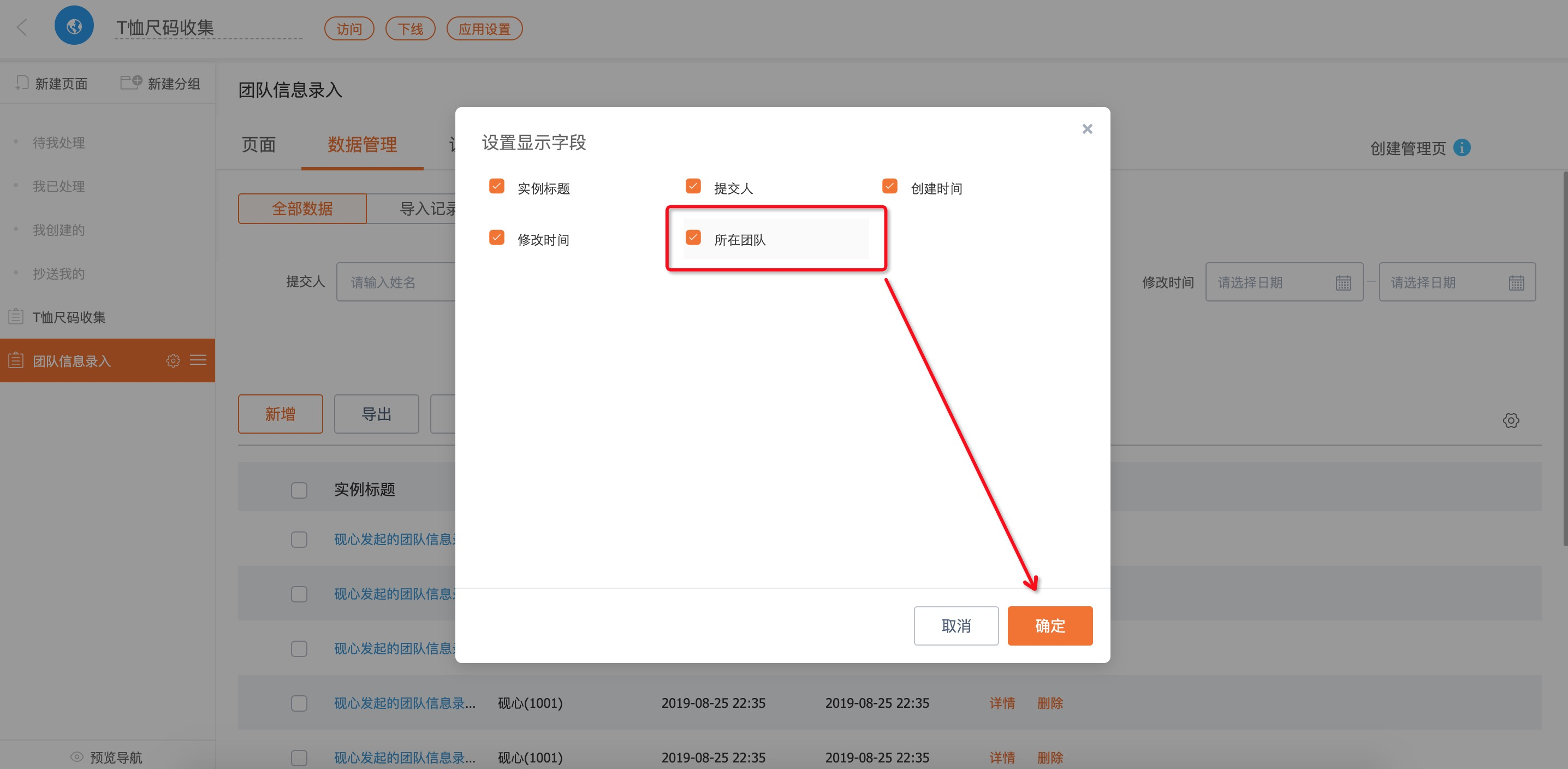 部门信息添加完成后,我们切换到“数据管理”页面,点击表格右上方的“齿轮”按钮,然后将“所在团队”勾选上,再点击“确定”,最后我们就能看到所提交的团队信息了。
