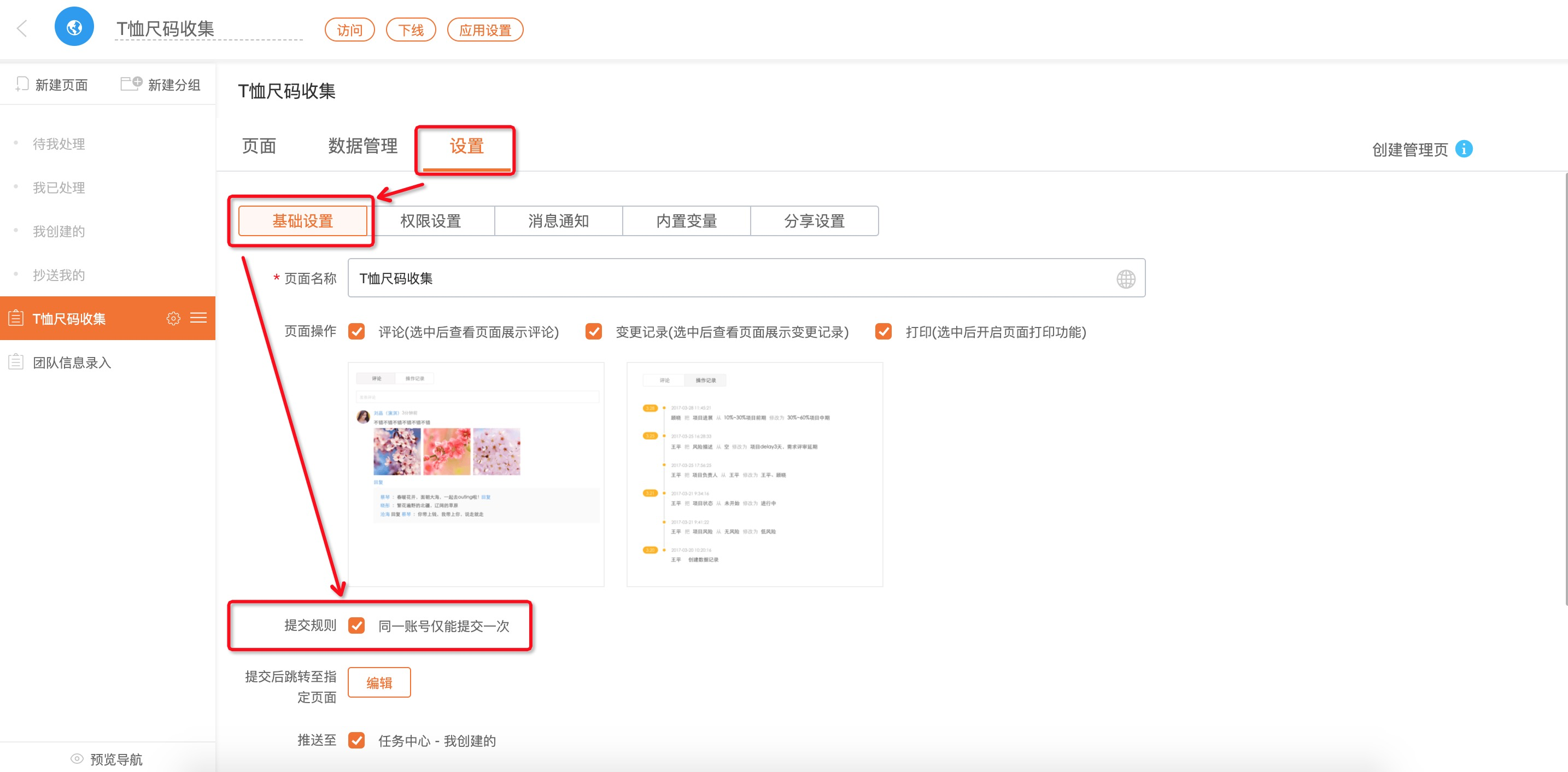 因为T恤尺码每个人只能提交一次,所以需要将“提交规则”设置为“同一账号仅能提交一次”,然后点击“保存”按钮保存。