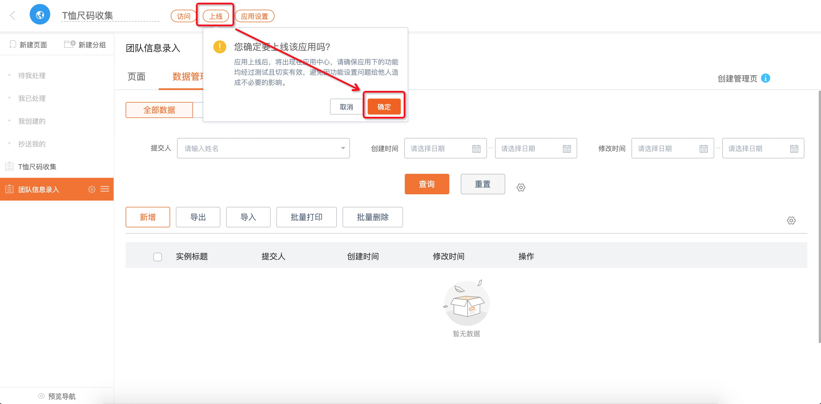 如果这时候出现「应用未上线,不能执行“提交”操作」的话,需要我们在管理后台,点击顶栏的“上线”按钮,然后点击“确定”,应用上线后,就可以添加数据了。