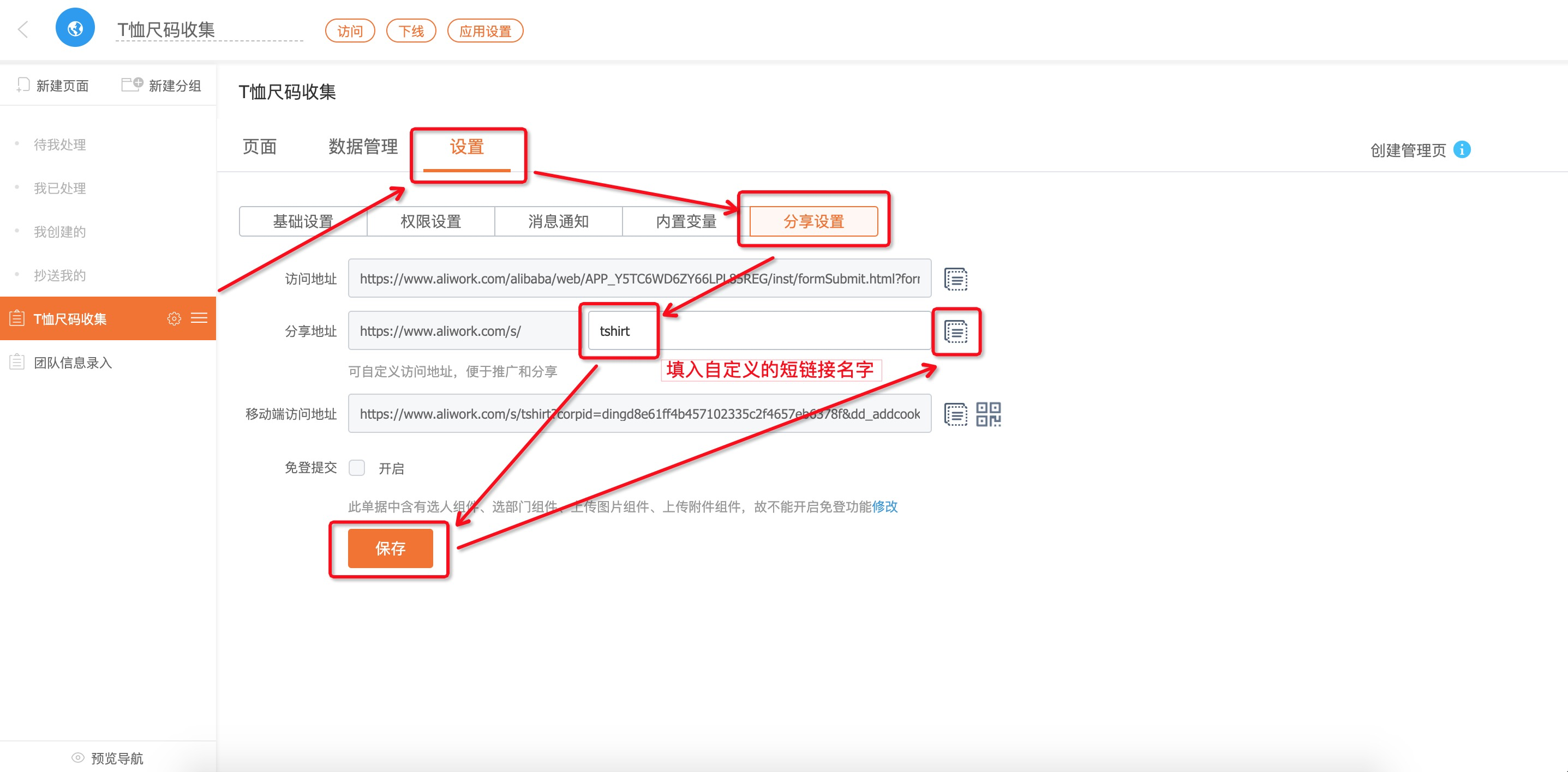 切换到“分享设置”,填入“tshirt”的短链名字,再点击“保存”按钮保存。最后点击“复制链接”的小图标,将链接复制好后,发送给公司的钉钉群中,让所有员工进行T恤尺码信息填写。