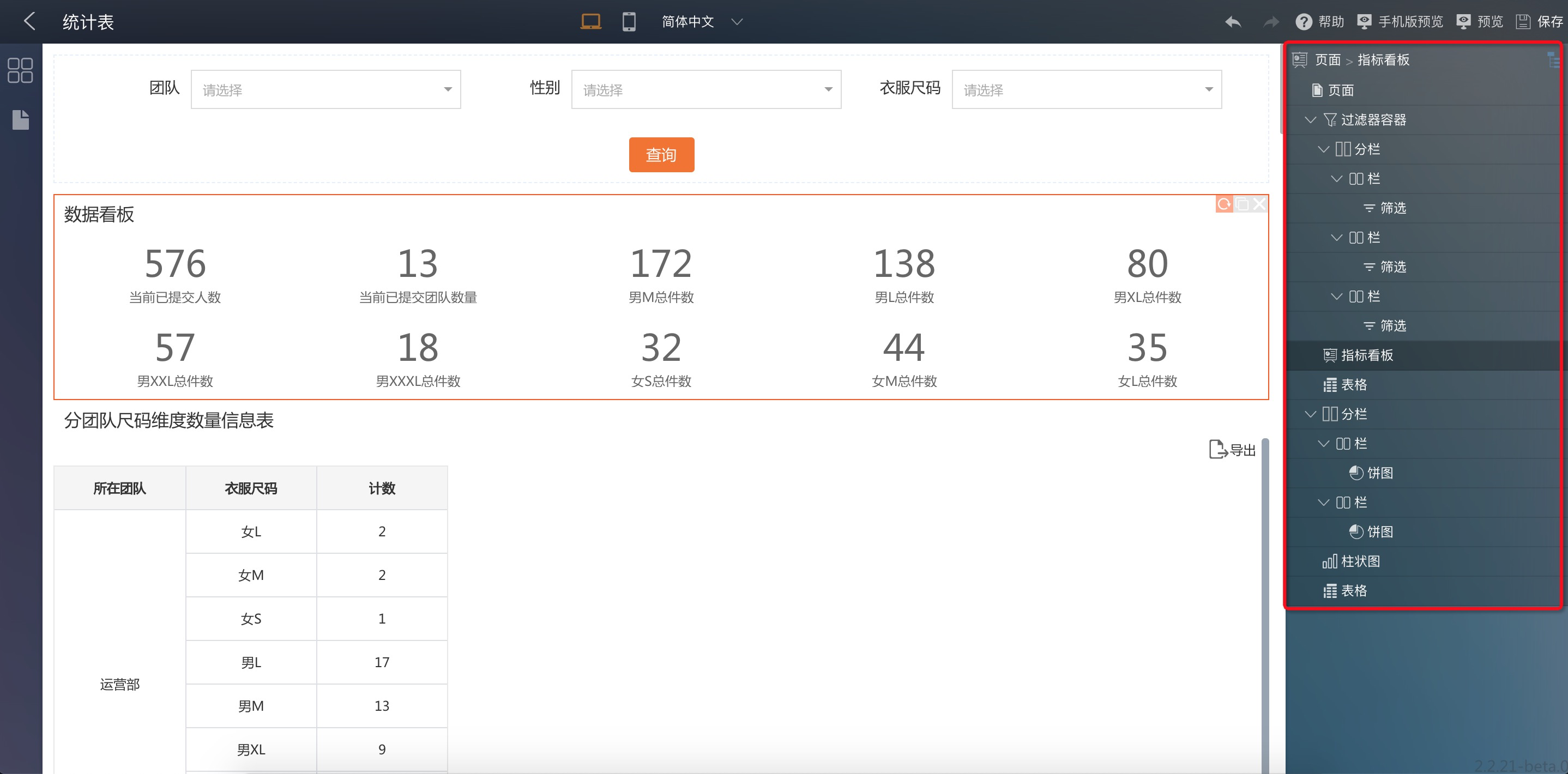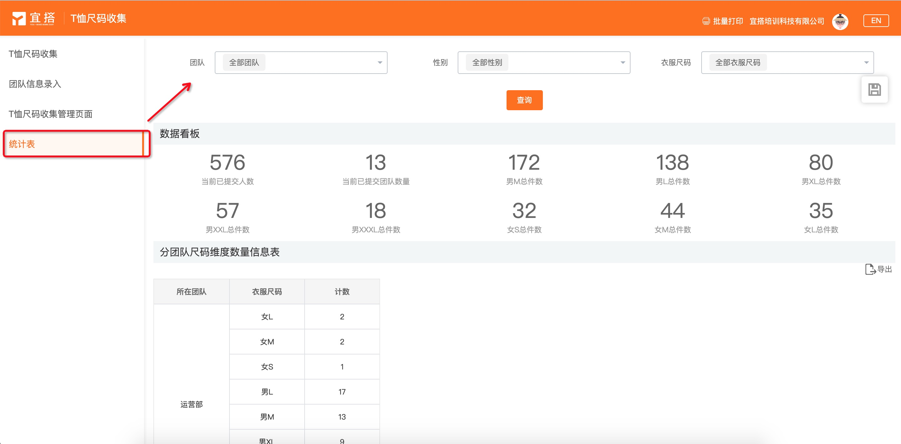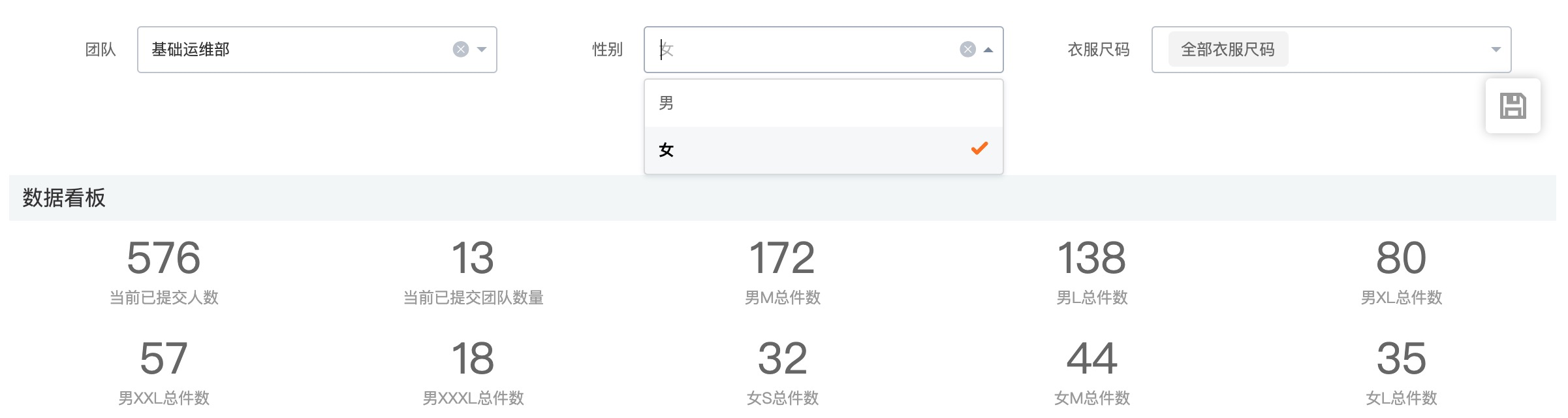 - 数据看板:统计提交人数、提交团队数和各种尺码的总件数等;