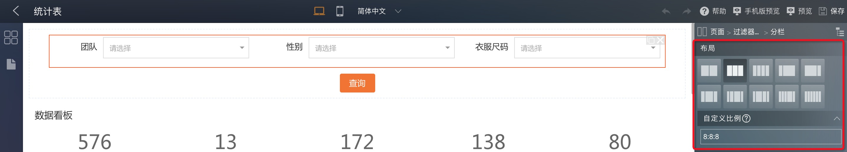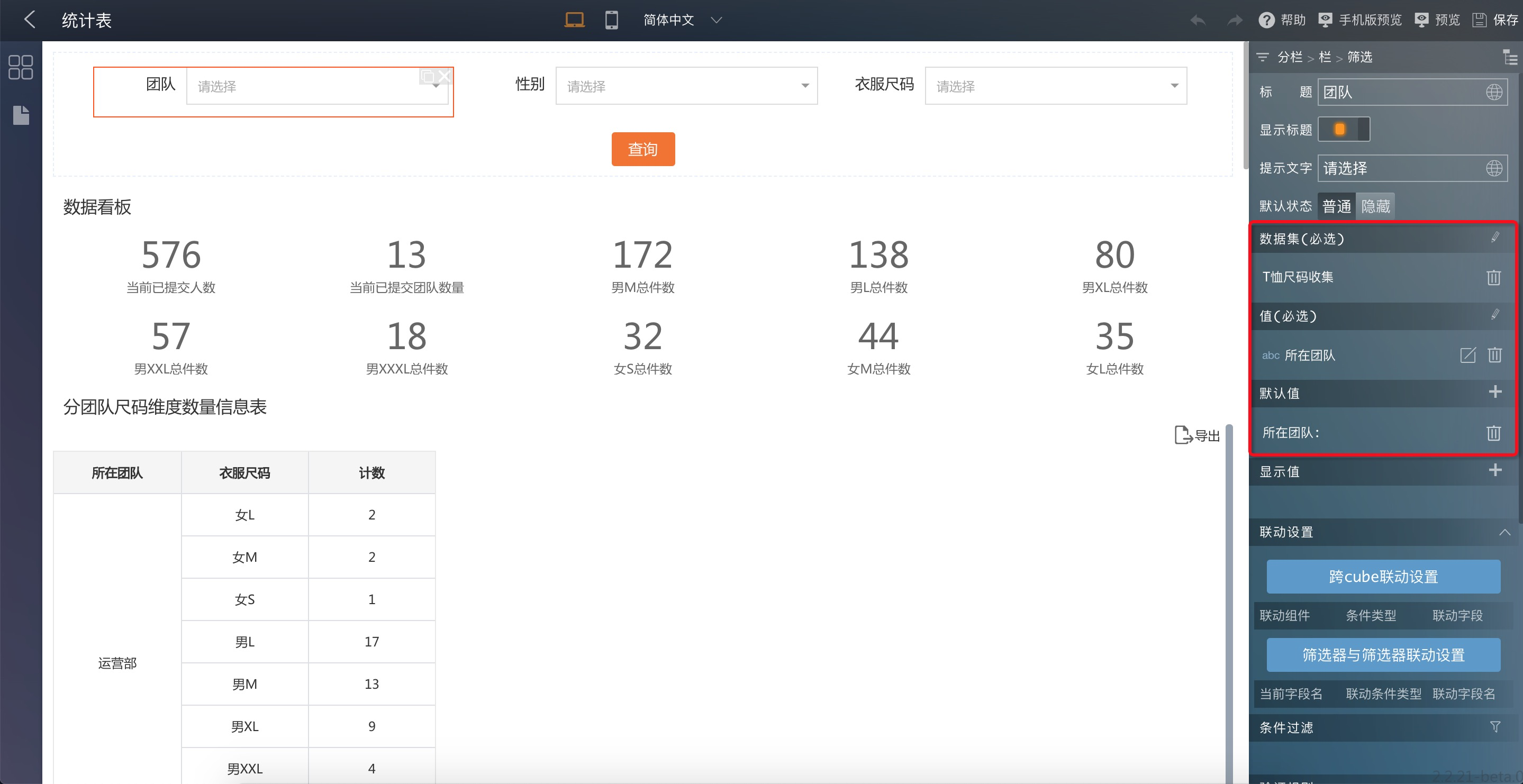 然后,拖入一个“筛选”组件,并取名为“团队”,选择数据集为“T恤尺码收集”表单,值选择对应的“所在团队”,默认值会自动带出来。