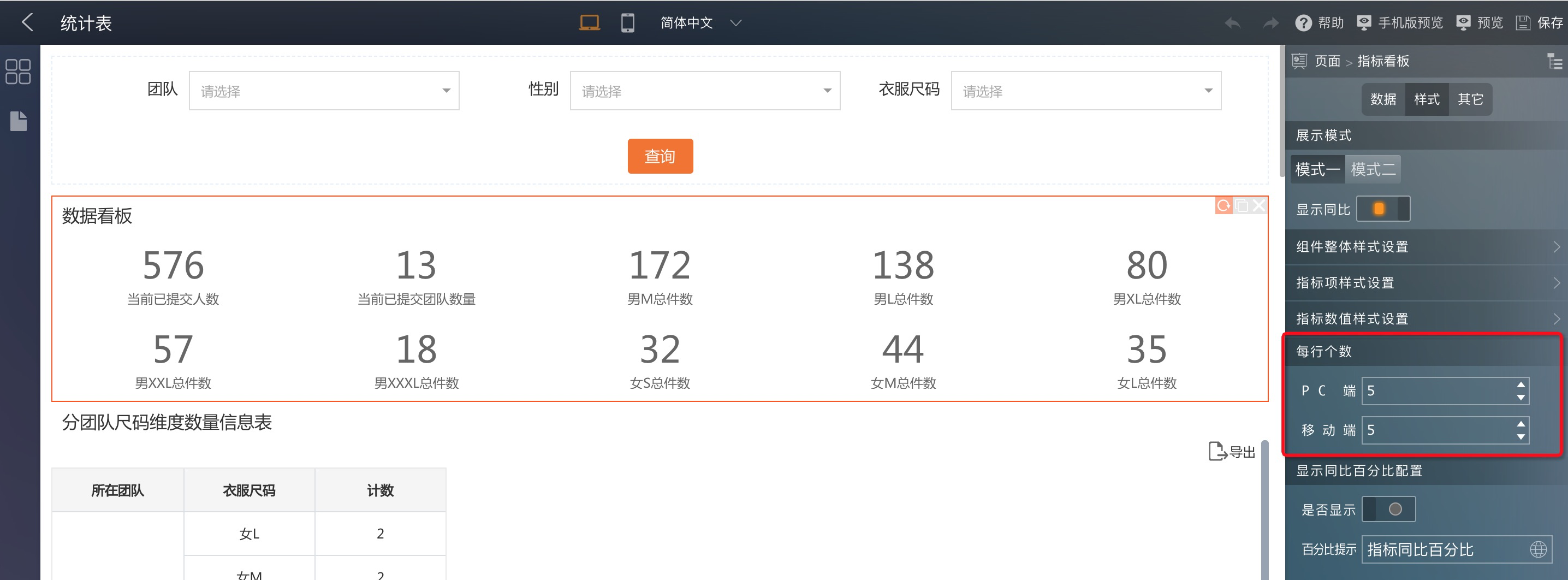 数据看板设置每行个数为 5 个。其它一些基础设置,可以自己摸索着玩。