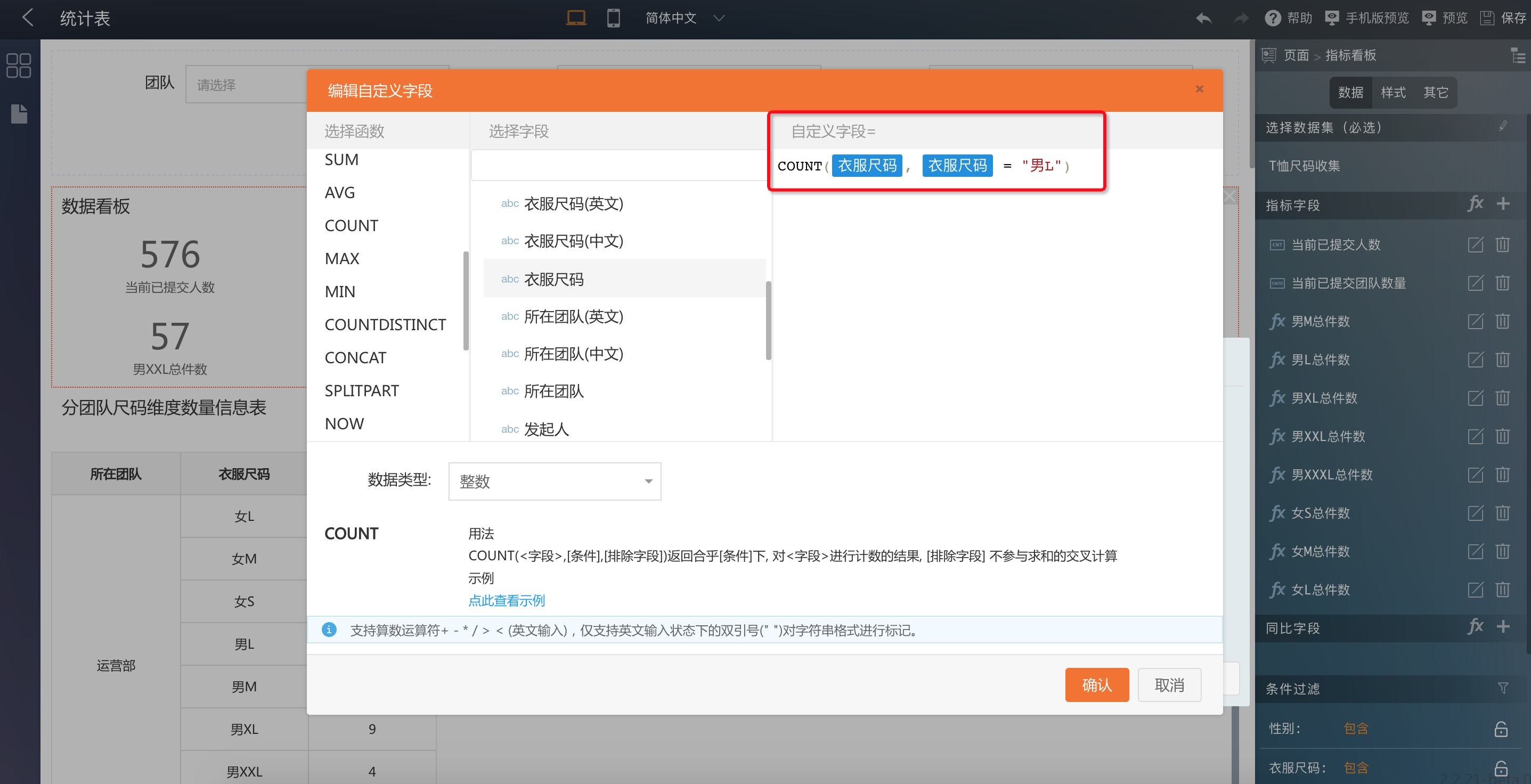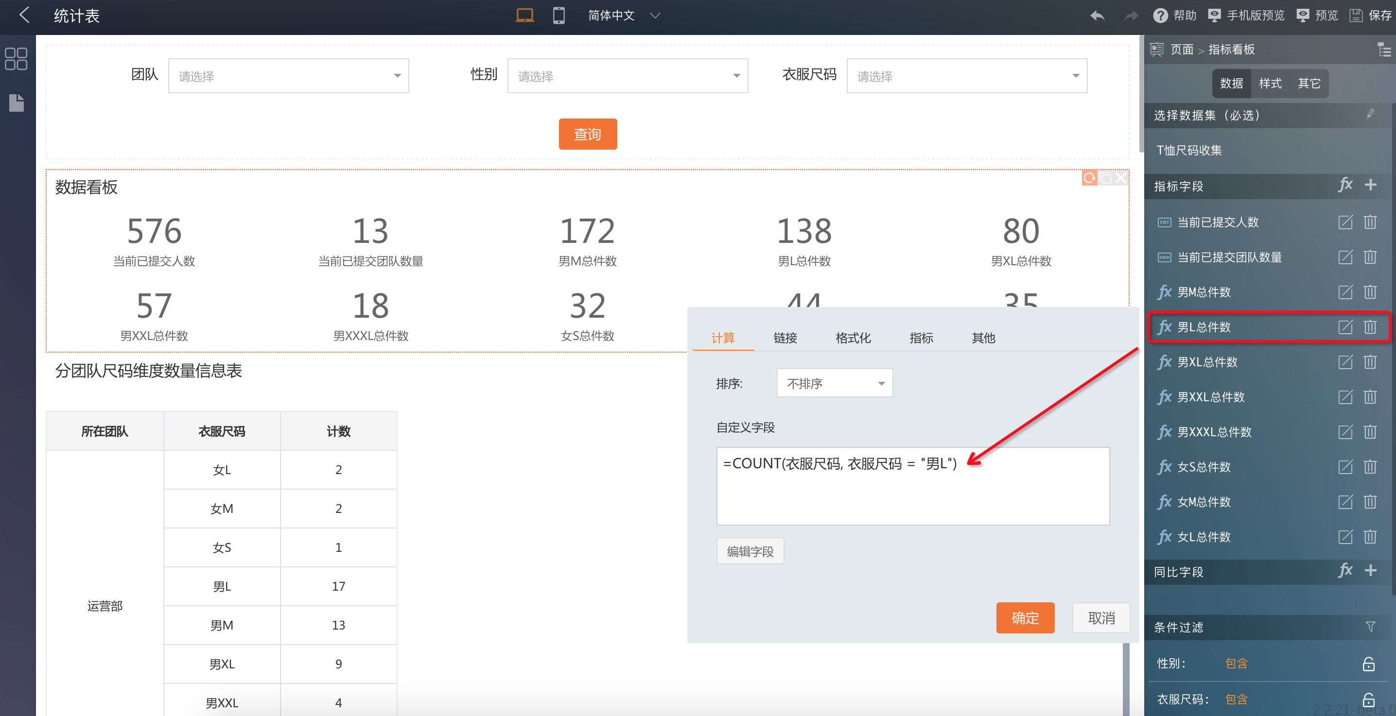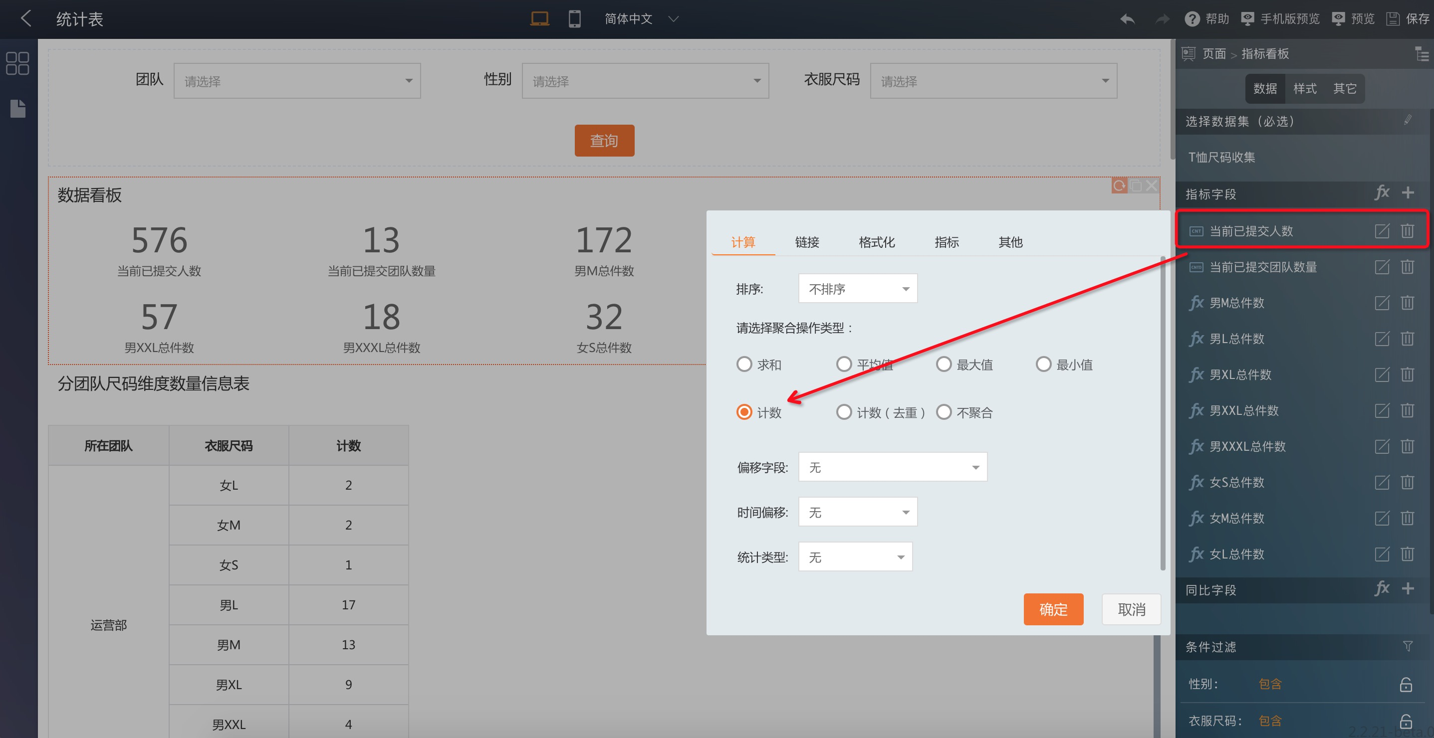 选择数据集为“T恤尺码收集”,然后指标字段,前两项选择T恤尺码收集里面的“提交人”和“所在团队”字段,并设置聚合操作为“计数(去重)”。