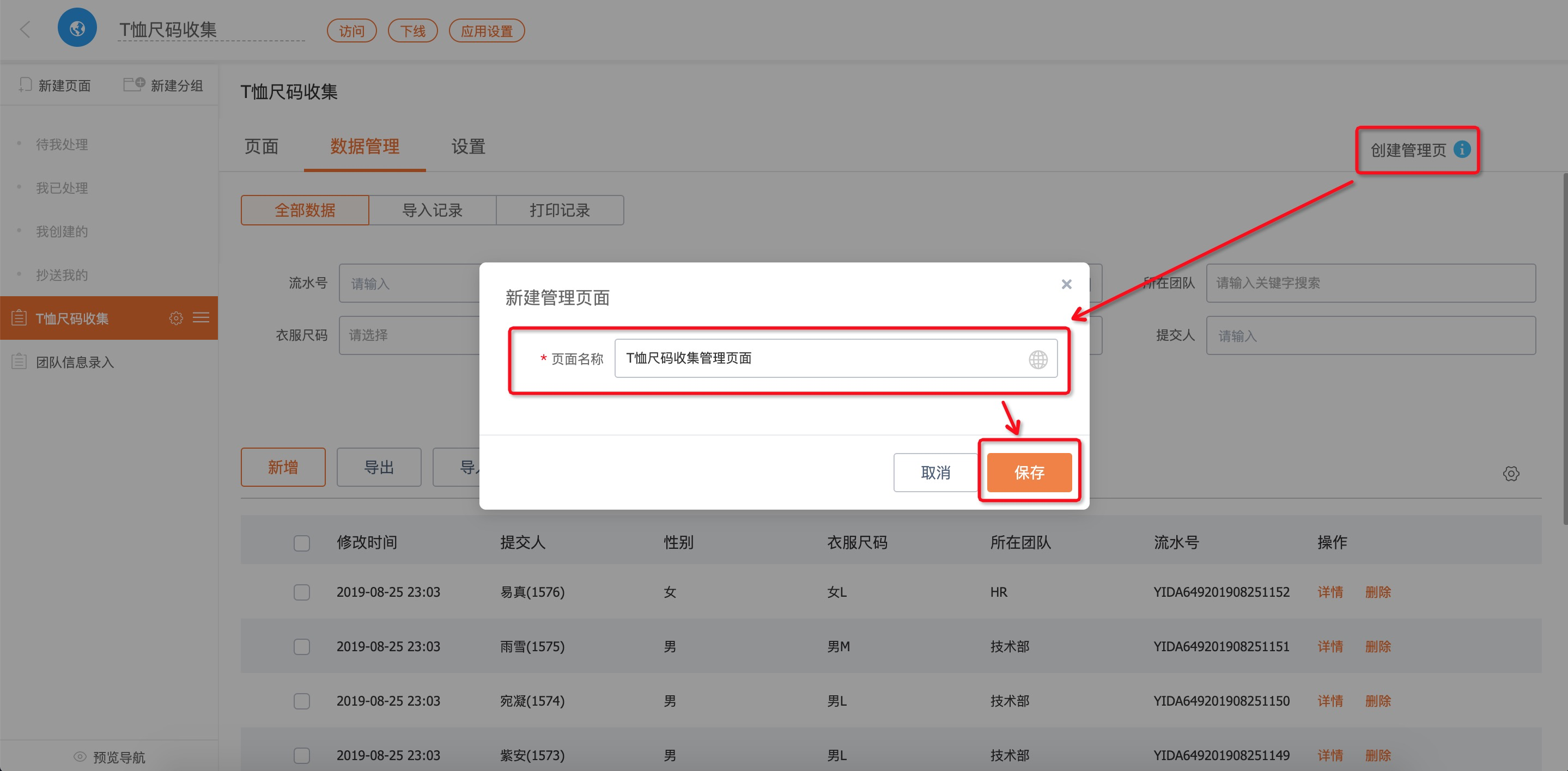 这时候,我们点击表格右上方的“创建管理页”,点击“保存”按钮,可以创建一个管理页面,这样前台用户也能看到全员提交的数据了。