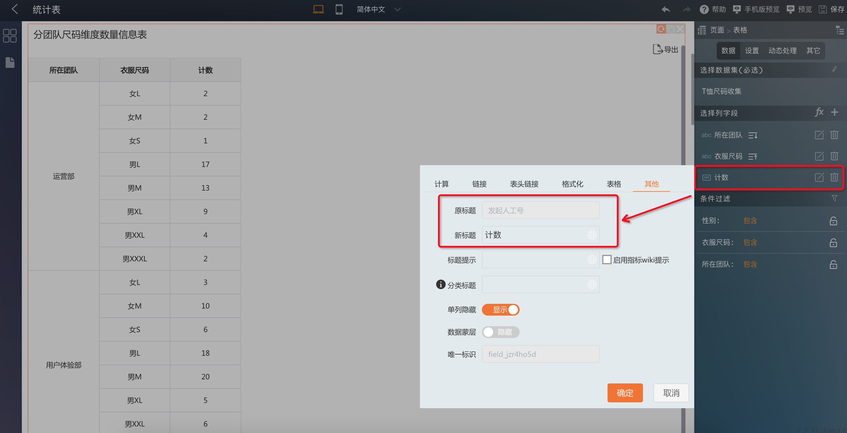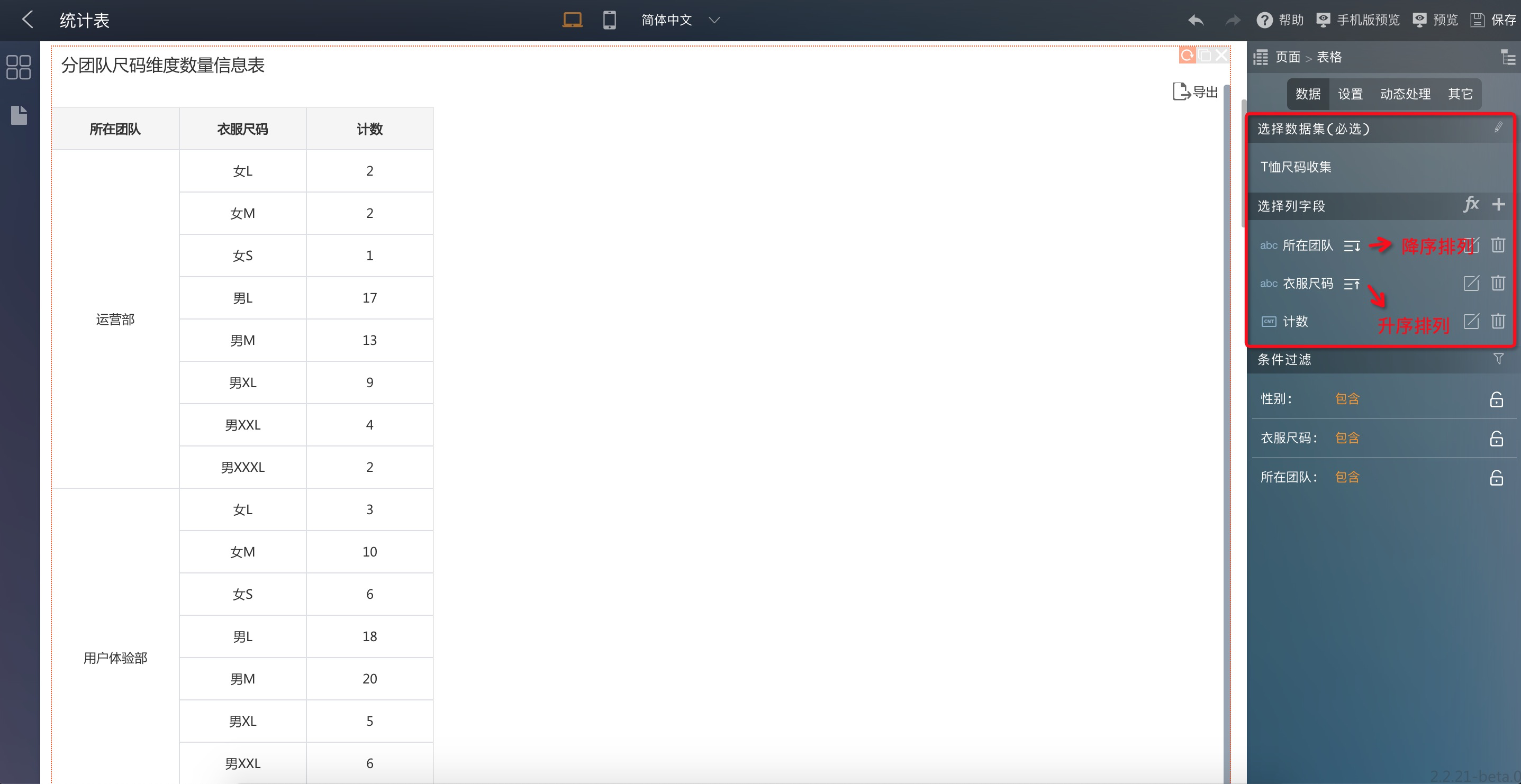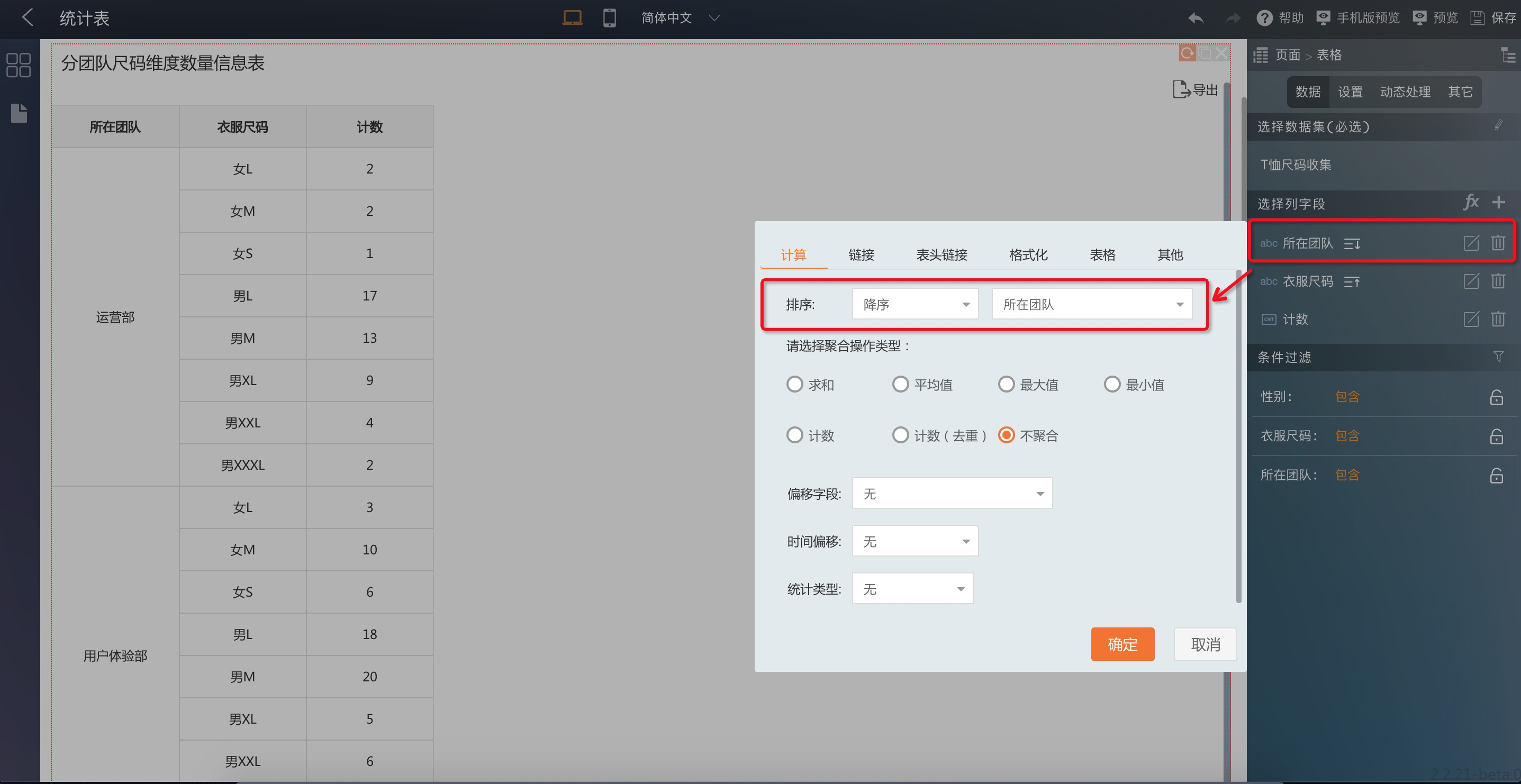 选择数据集“T恤尺码收集”,然后选择列字段为“所在团队”、“衣服尺码”、“发起人工号”,其中“所在团队”采用降序排列,“衣服尺码”采用升序排列,“发起人工号”采用计数的聚合操作,并修改名字为“计数”