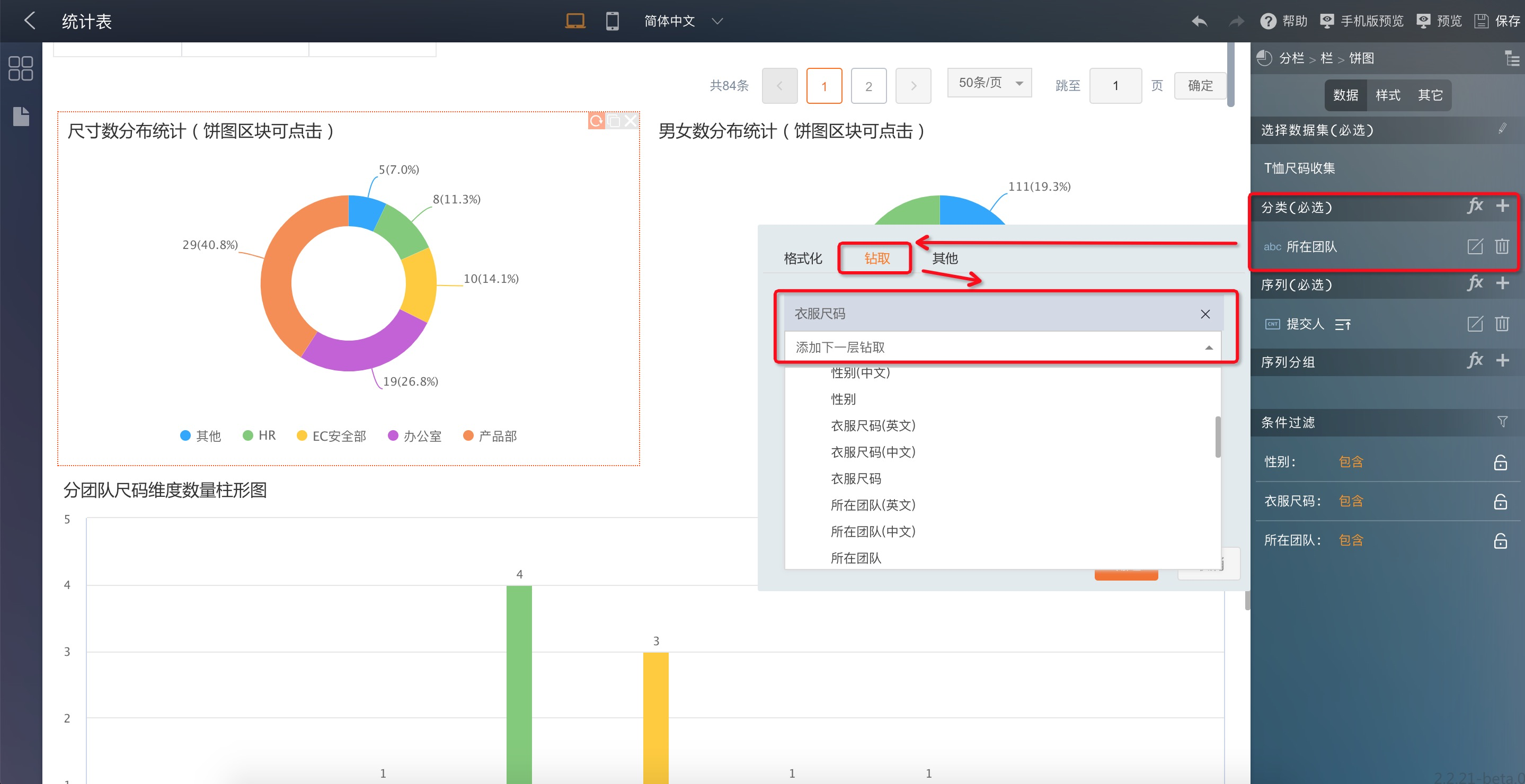 选择数据集为“T恤尺码收集”,然后分类选择“所在团队”,序列选择“提交人”,按照升序排列,并采用计数的聚合操作。其中,“所在团队”,配置它的钻取为“衣服尺码”,这样,当点击饼图区块的时候,就能看到详细的尺码统计。