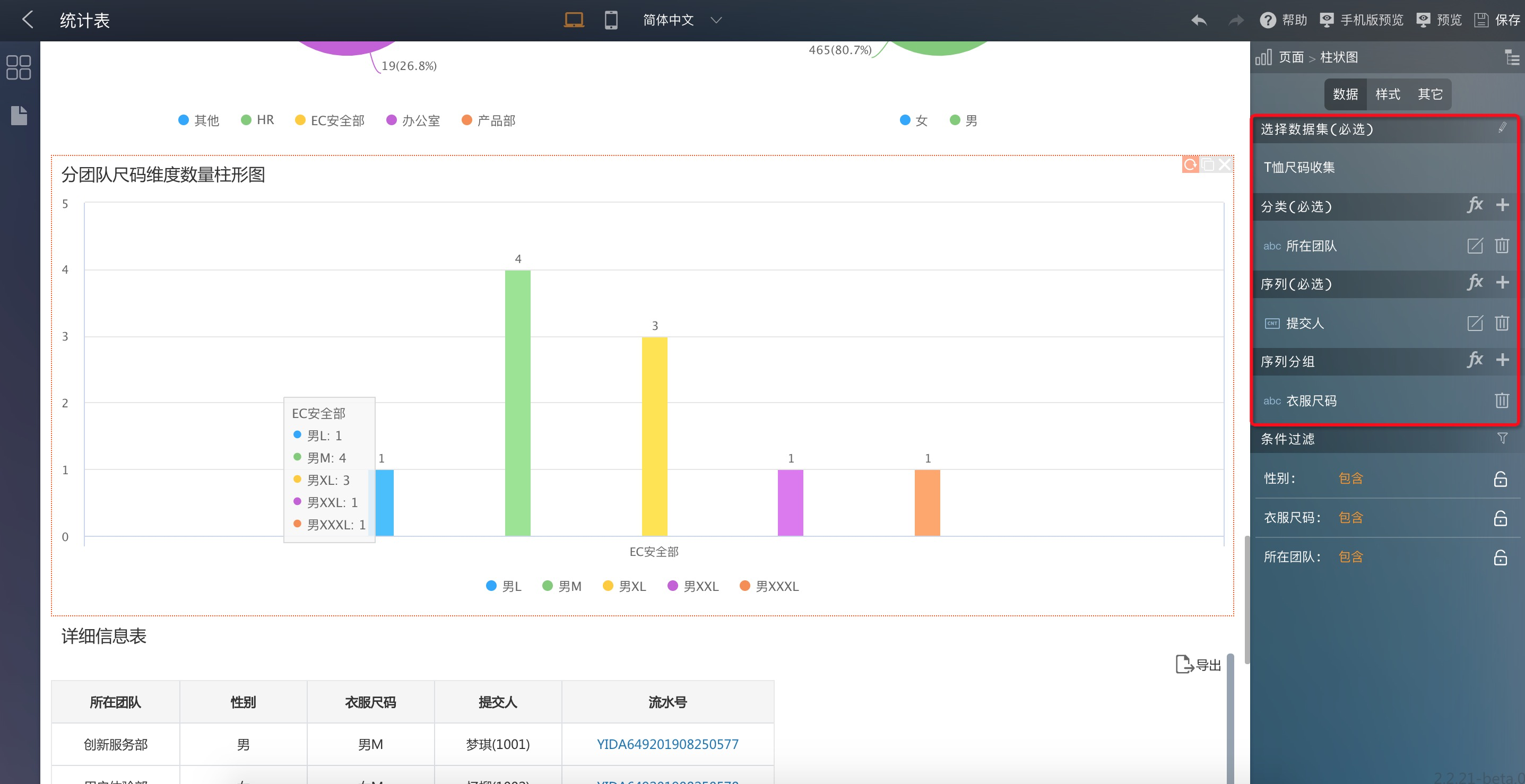 柱形图,选择数据集为“T恤尺码收集”,分类选择“所在团队”,序列选择“提交人”,并采用“计数”的统计,序列分组选择“衣服尺码”作为分组标识。
