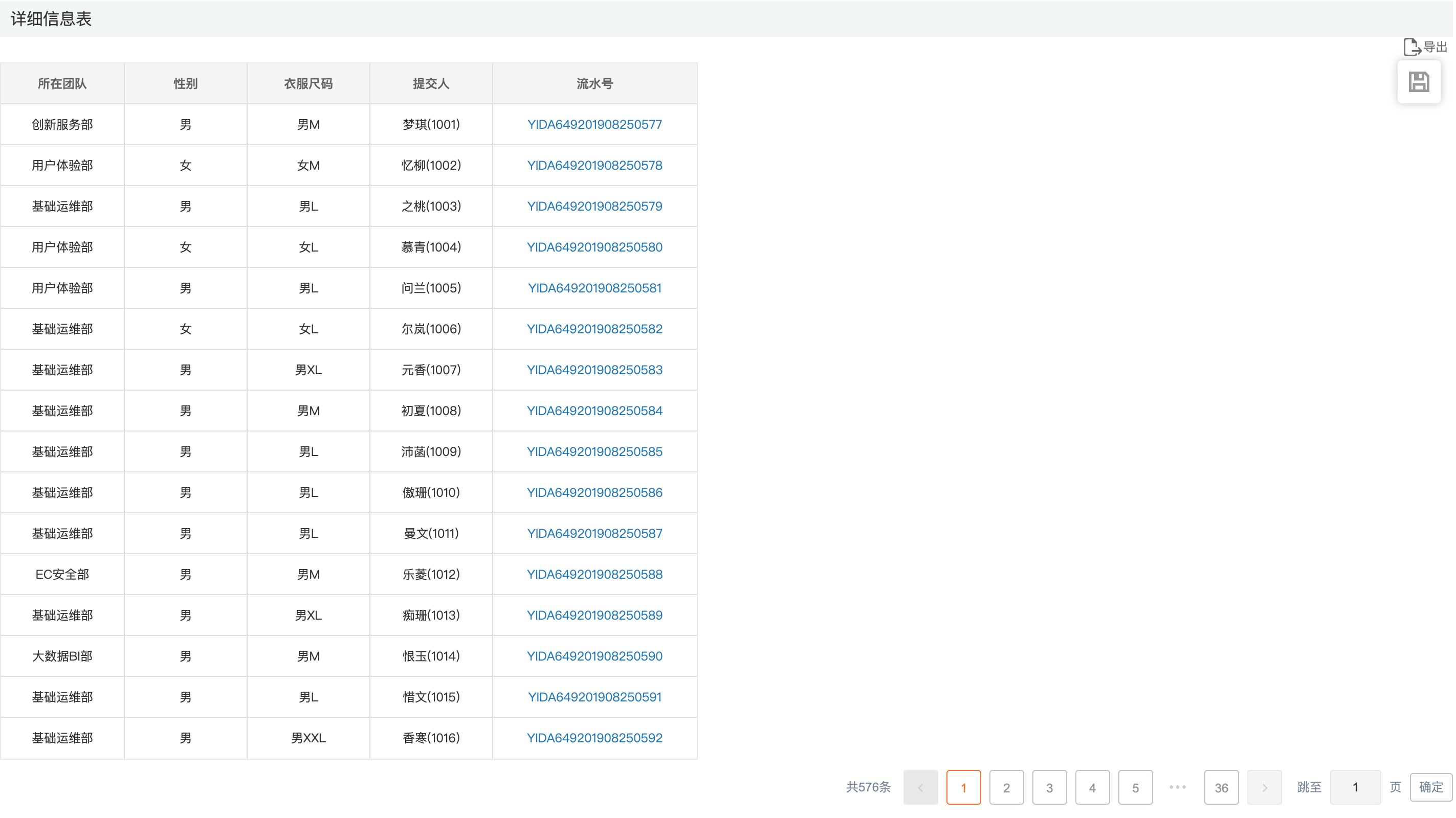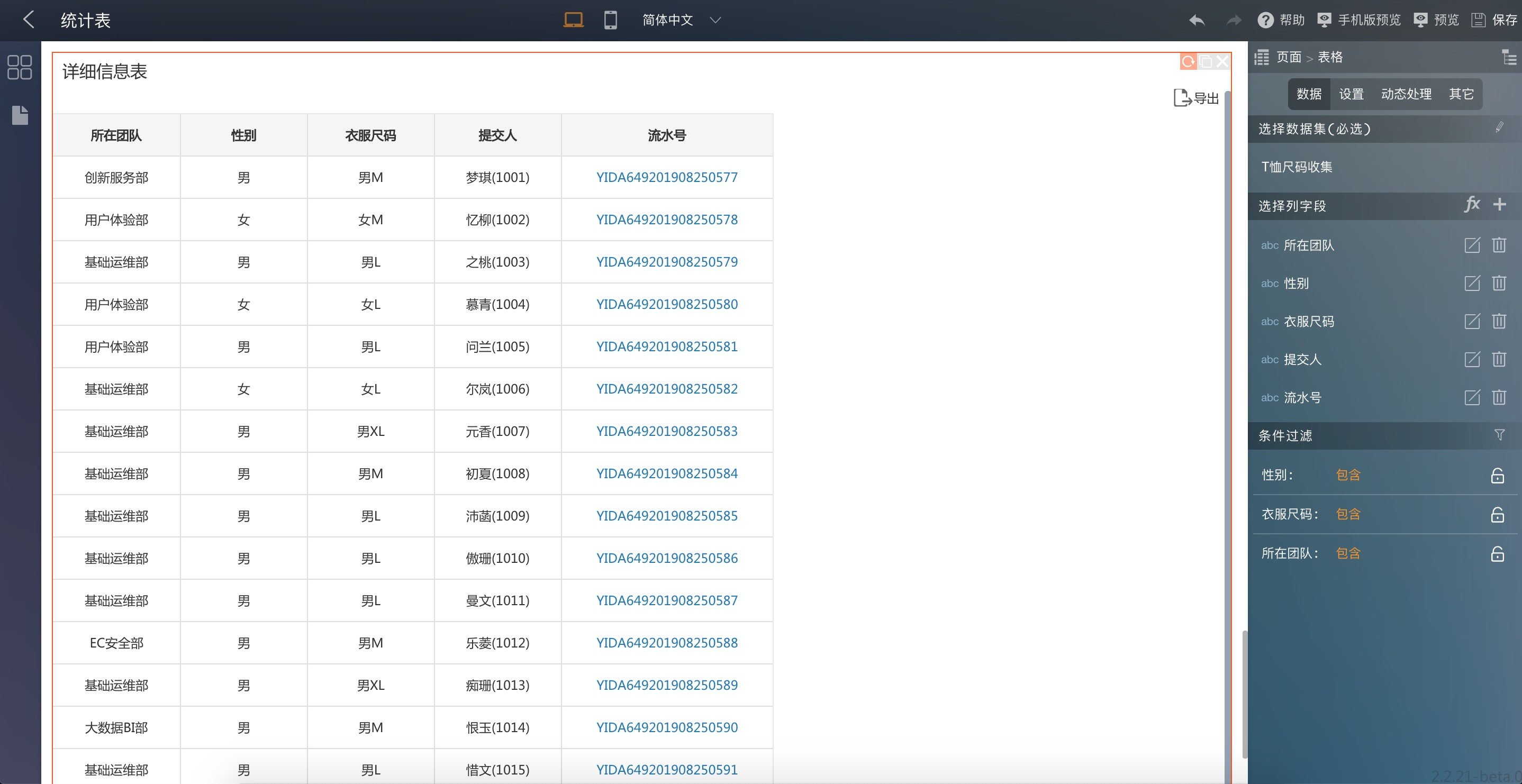 - 详细信息表:将“T恤尺码收集”提交的数据集进行详细的表格展示,同时也可以导出为Excel,方面对数据进行二次加工处理。