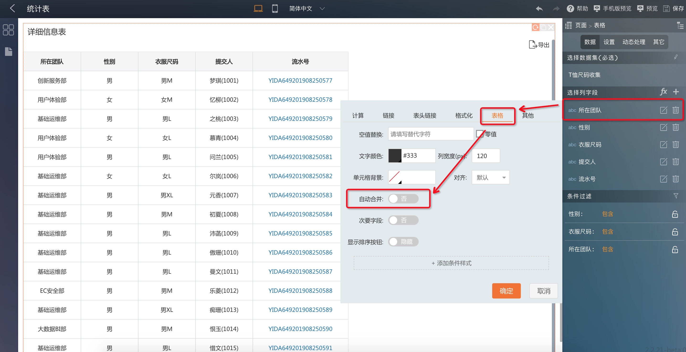 详细信息表,选择数据集为“T恤尺码收集”表,然后字段添加“所在团队”、“性别”、“衣服尺码”、“提交人”、“流水号”等字段,其中所有的字段均设置为“不自动合并”。