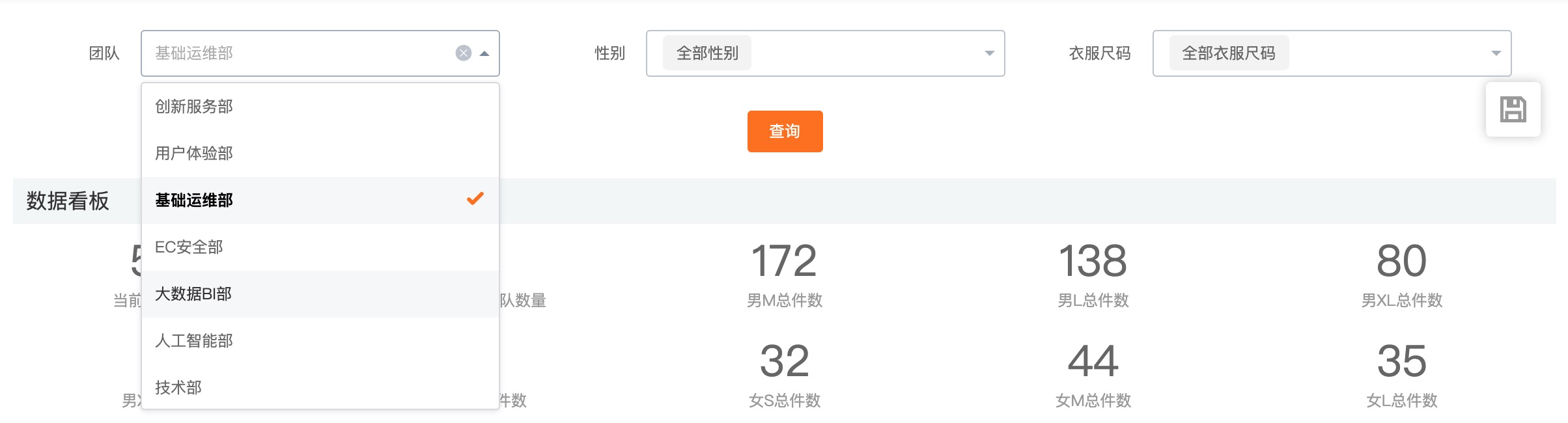 - 顶部查询:可以精确查询团队、性别和衣服尺码等维度;