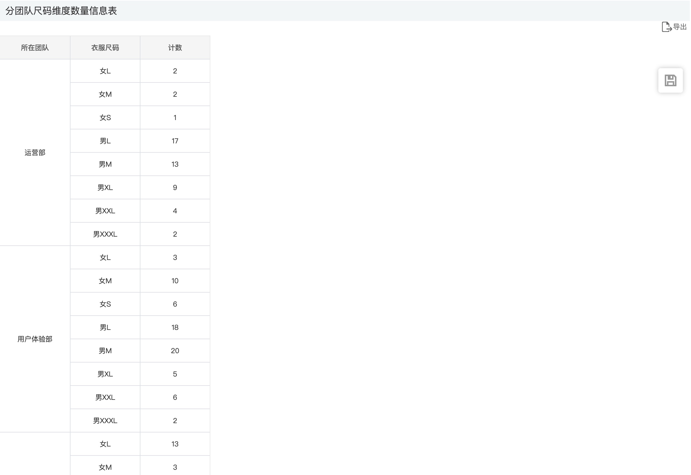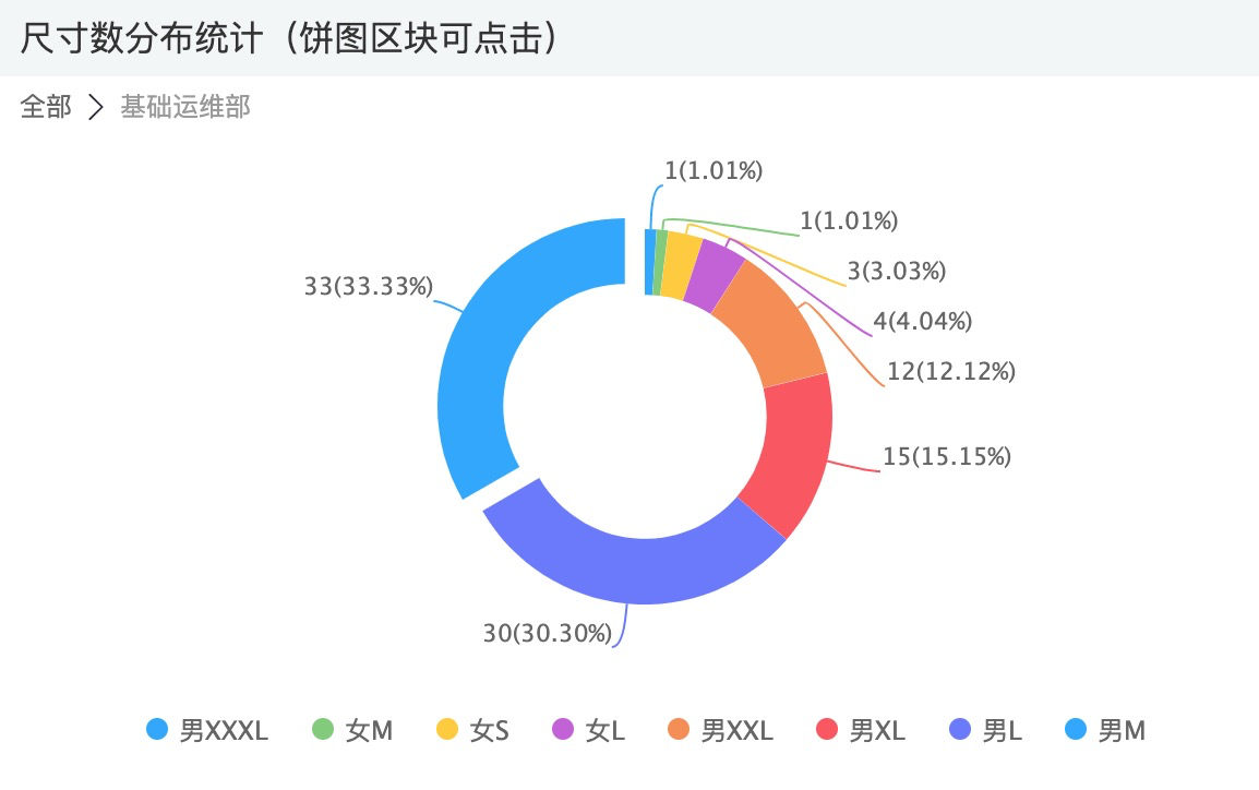 - 尺寸数分布统计饼图:将“分团队尺码维度数据信息表”中的每个团队需要的T恤总数统计出来,并且饼图区块可点击,点击进去之后,会展示团队对应的具体衣服尺码的分类数;