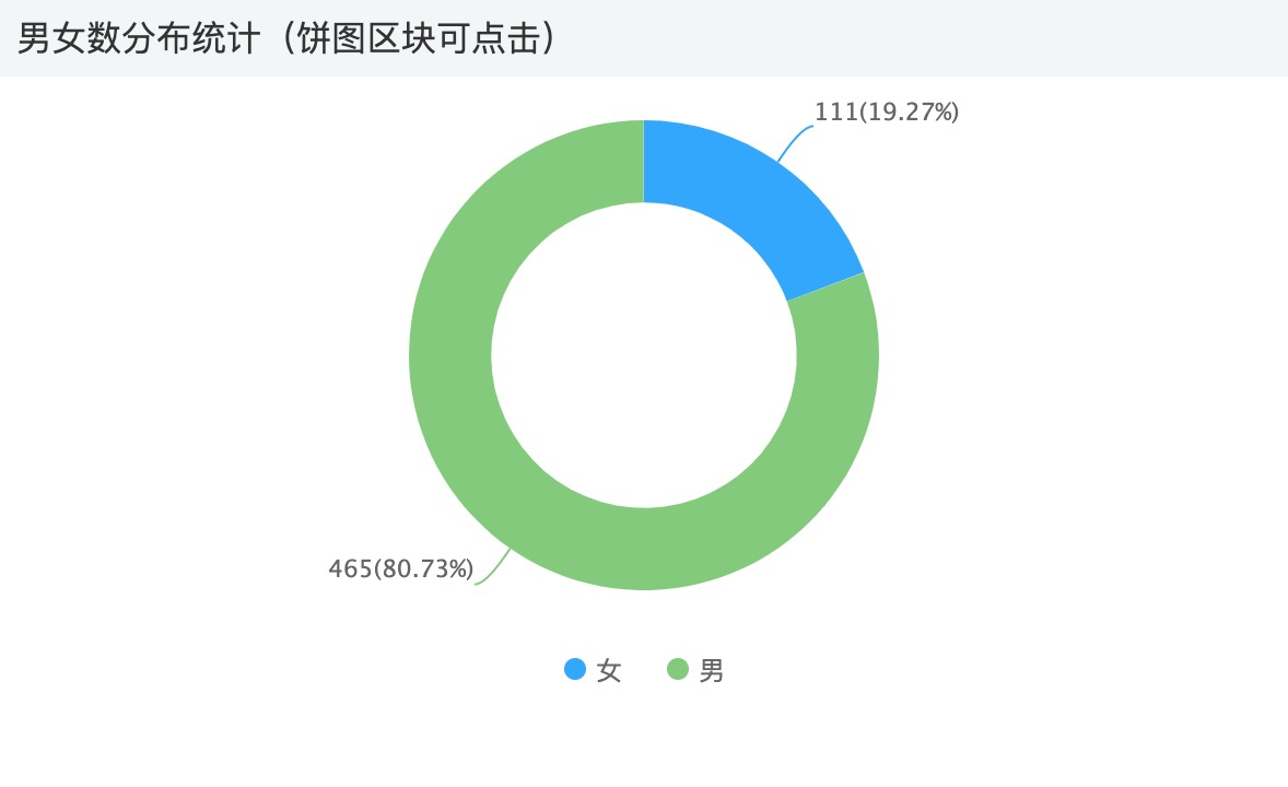 - 男女数分布统计饼图:统计男女性别分类的总数,同时饼图区块可点击,点击进去之后,会展示性别对应的具体衣服尺码的分类数;