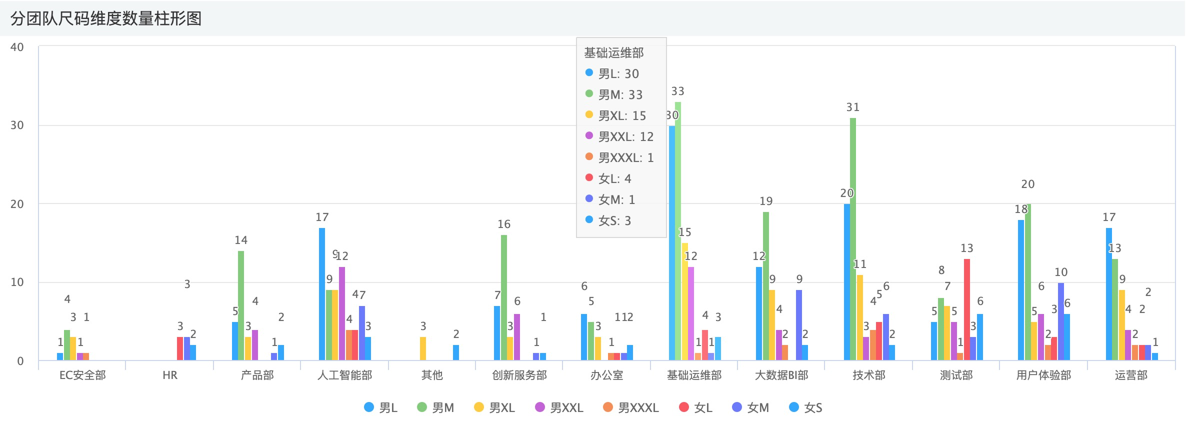 点击下钻后的部门详细尺码分布,以“基础运维部”为例。