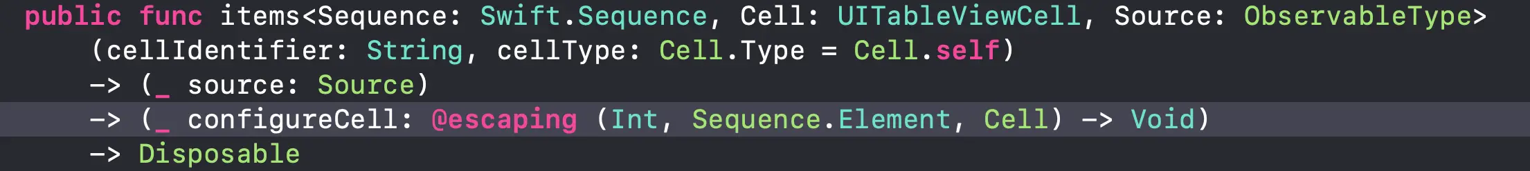 .items(cellIdentifier: "Cell", cellType: UITableViewCell.self)) { (row, text, cell) in