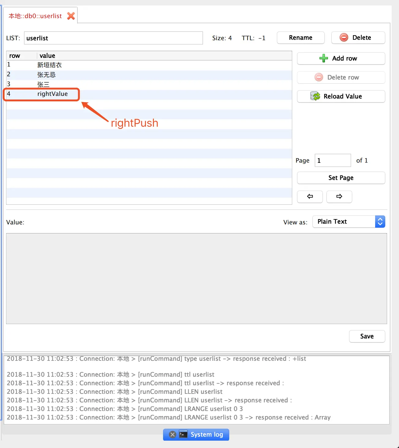 redisTemplate.opsForList().rightPush("userlist","rightValue");