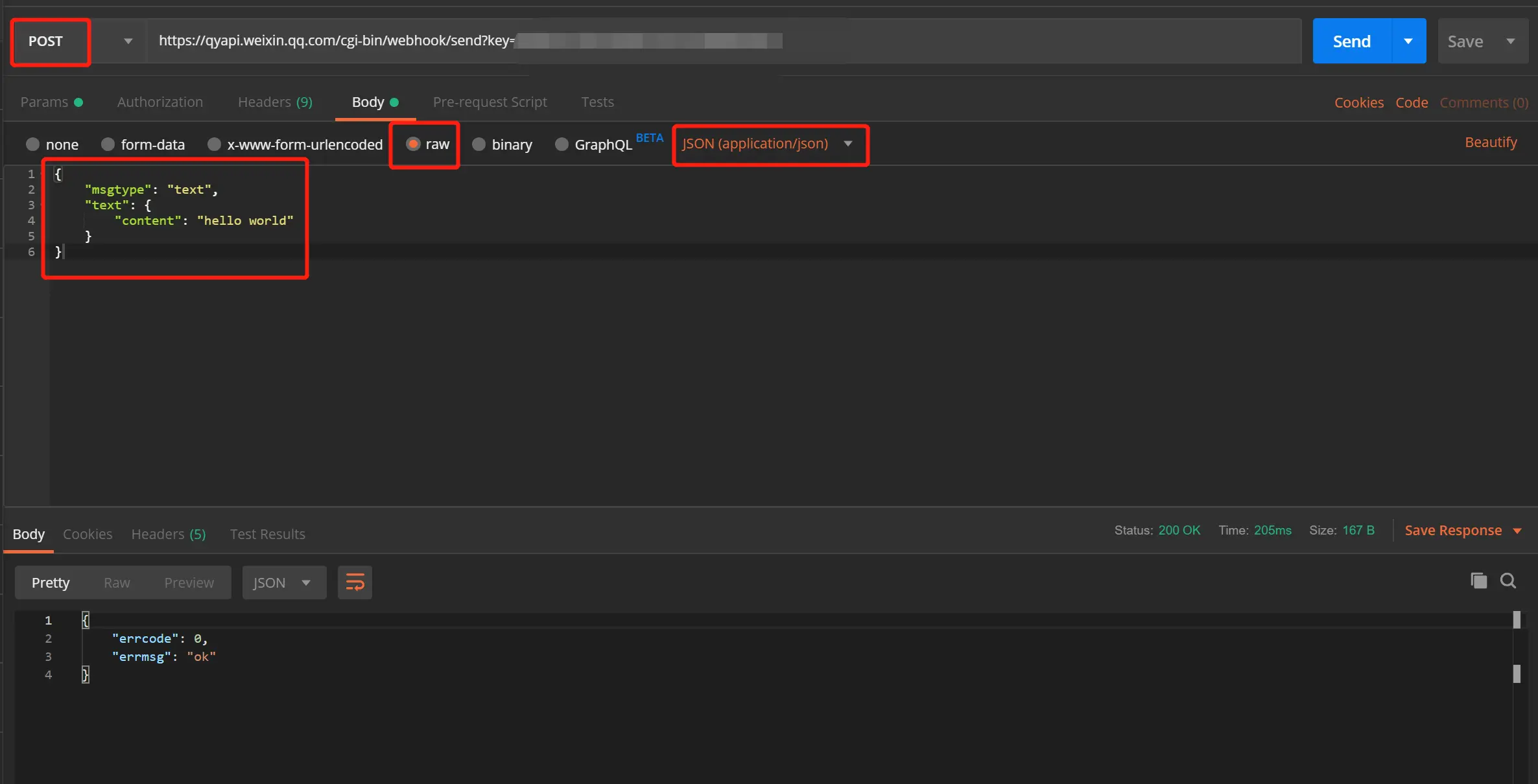 通过POST方式请求发送一个text类型的消息,消息内容为hello world