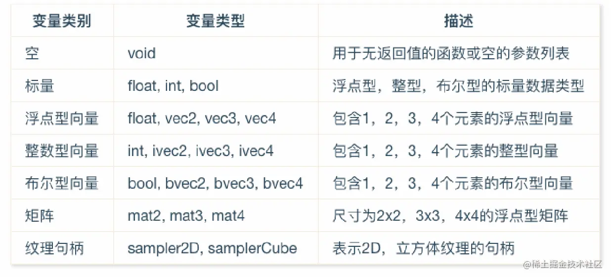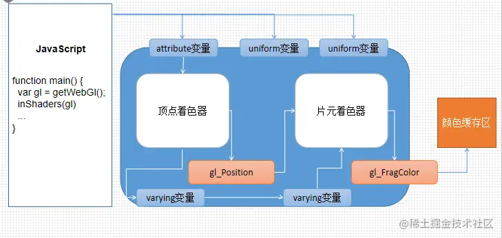 - attribute 由应用程序传输给顶点着色器的逐顶点的数据