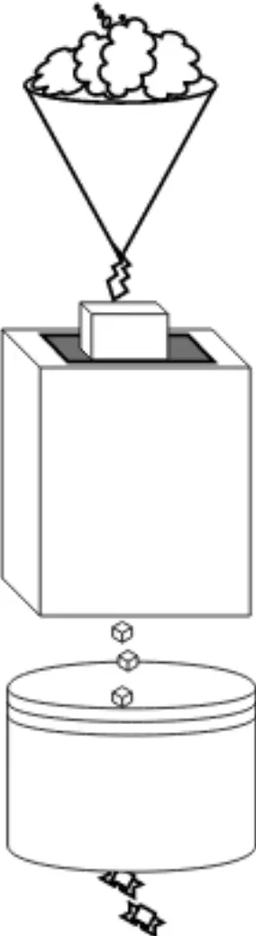 我们假设你是流水线上的一个工人,你的任务是维护和改造这条流水线。第一步我们将融化的巧克力倒进漏斗,然后千克力就被变成一个个大的巧克力方糖;然后进入下一个机器,这个机器将大的方糖切成小方糖;再然后小方糖进入最后一个机器,被做成糖果。