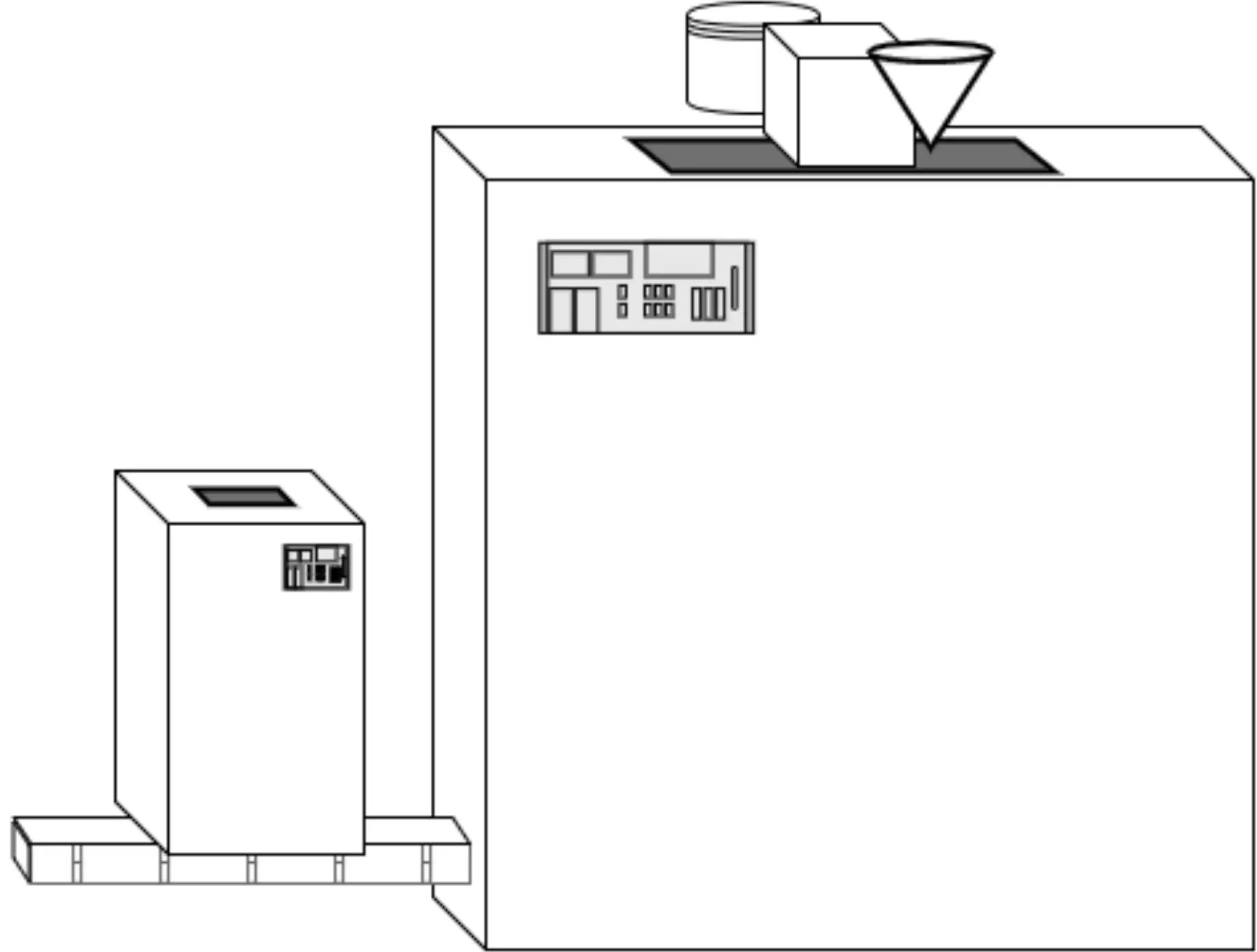 回到工厂里来,是的没错,为了完成老板的任务,其实我们只需要在整个机器外边套一个大箱子就可以了,箱子上我们搞一个控制面板,方便我们修机器,对于工人来说,他们只需要打开开关,放入材料,所有的一切就可以自动运转了。就像这样: