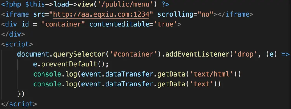拖放劫持主要利用html5 的拖动事件中的dataTransfer对象,包含setData,getData;页面间拖动没有同源策略限制,因此我们就能轻易的通过视觉欺骗诱导用户拖动目标页面到当前页面,进而可以获取页面数据,包括token;