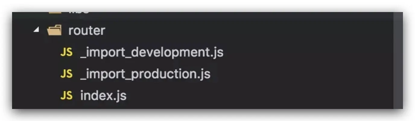 之前查了很多资料没有得到解决,随后在网上找了一位大牛解决了这个问题(还是有很多厉害的人愿意为你解决问题),现在写到这里给自己做一个笔记, 在router文件下面创立两个js文件,分别为_import_development.js和_import_production.js,如图: