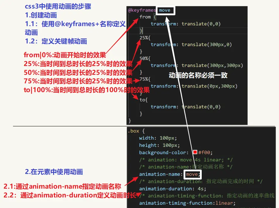 1.@keyframes:关键帧,多个关键帧连续的播放就组成了动画,@keyframes属性可以用来定义多个关键帧