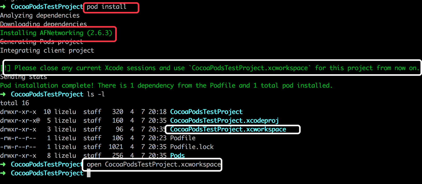 配置完Podfile文件,接下来就是该在相关的工程中安装相关的依赖了。下方使用了pod install来安装相关的依赖,使用pod update来更新相关的依赖。在安装依赖时会提示安装了哪些依赖的库。因为CocoaPods在安装后会修改我们的Xcode工程,生成一个工作空间,这个工作空间由我们的Project工程和Pods工程组成,我们所依赖的仓库就位于这个Pods工程中,所以安装完毕后提示要通过xxxx.xcworkspace文件来打开整个工程。pod install完毕后,我们会发现整个工程中多了一些文件,比如xxxx.xcworkspace、Pods、Podfile.lock等。我们就通xxxx.xcworkspace来打开相关文件,其他文件稍后会介绍到。