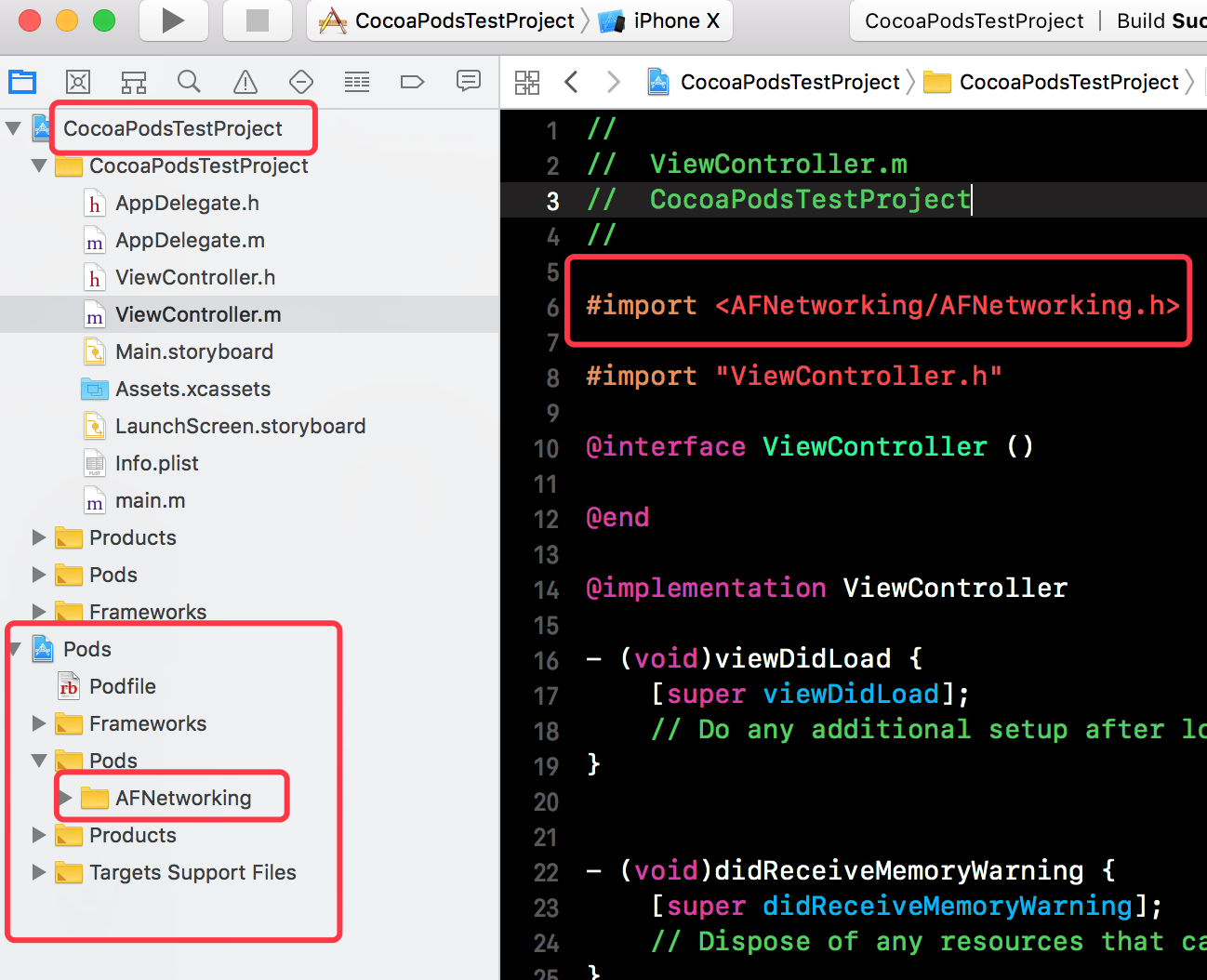 下方就是我们通过open CocoaPodsTestProject.xcworkspace打开的相关工程。下方的Pods中就包括相关依赖的仓库。我们就可以在我们的工程中直接引入使用所依赖的仓库了。上面也提到了,安装后会生成一个工作空间workspace。该workspace就由我们原有的工程和新增的Pods工程组成。通过CocoaPods管理的依赖库都会放在这个Pods工程中。具体如下所示:
